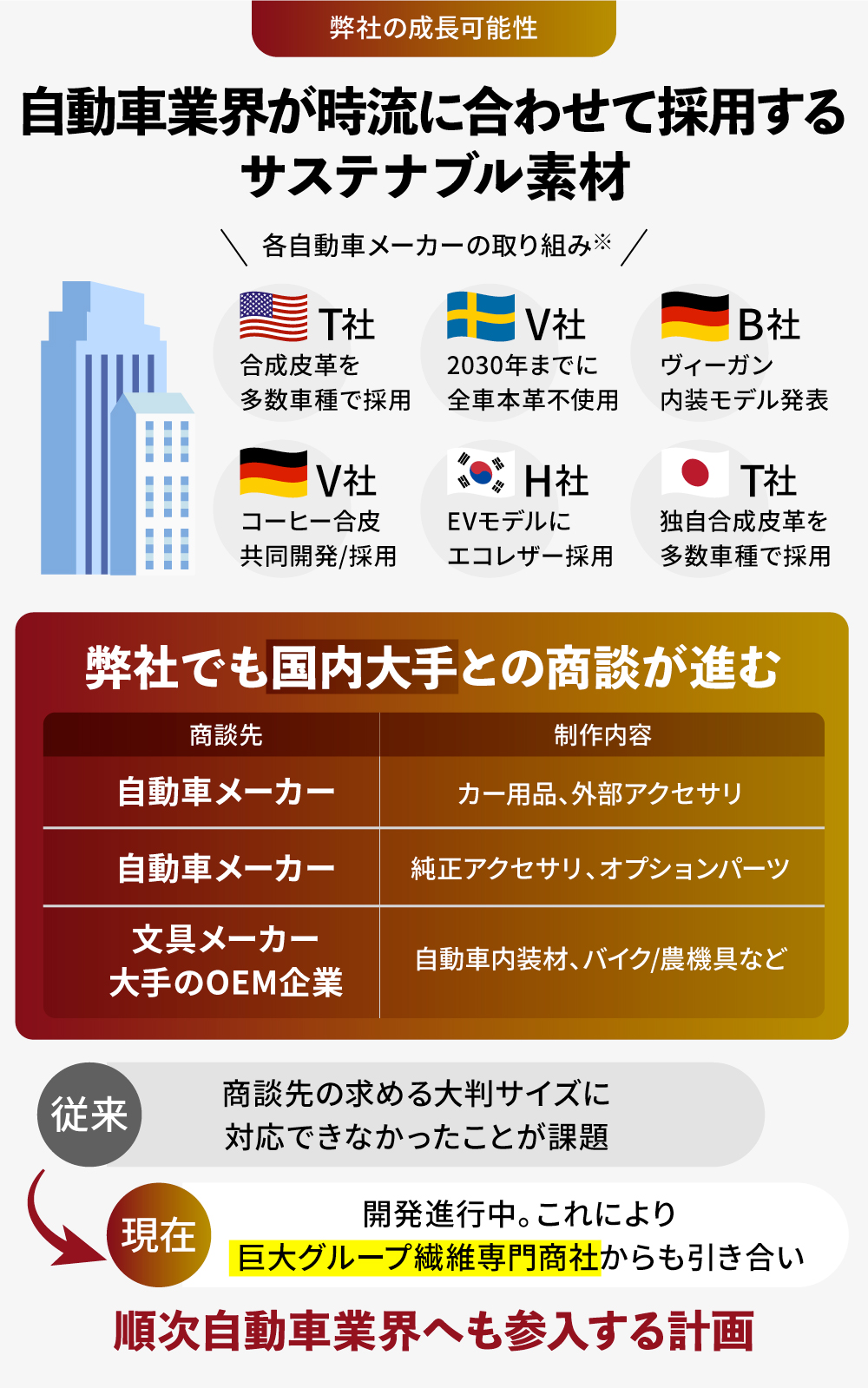 ãšããããèªåè»æ¥çã¯äžçã§å¹ŽéçŽ9,300äžå°â»2ãåœå ã§ã幎éçŽ820äžå°ïŒè£œé ååºè·é¡çïŒçŽ62å åïŒèŠæš¡â»3ãçç£ããã巚倧åžå Žã§ããç±³åœå€§æT瀟ãã¹ãŠã§ãŒãã³V瀟ã¯EVã¢ãã«ã§æ¬é©ã®å šé¢çãªäžäœ¿çšã宣èšããã€ãé«çŽè»å€§æ3瀟ããäžéšãã©ã³ããè»çš®ããªãã·ã§ã³ã§ã¬ã¶ãŒããªãŒå è£ ã®å°å ¥ãé²ããŠããŸããæ¥æ¬ã¡ãŒã«ãŒã代æ¿çŽ ææ¡çšã®æ€èšŒãæ¬æ ŒåãããŠãããåŒç€Ÿã¯èªåè»æ¥çãã¡ã€ã³ã«ãååŒæ¡å€§ãå³ã£ãŠãããŸãã