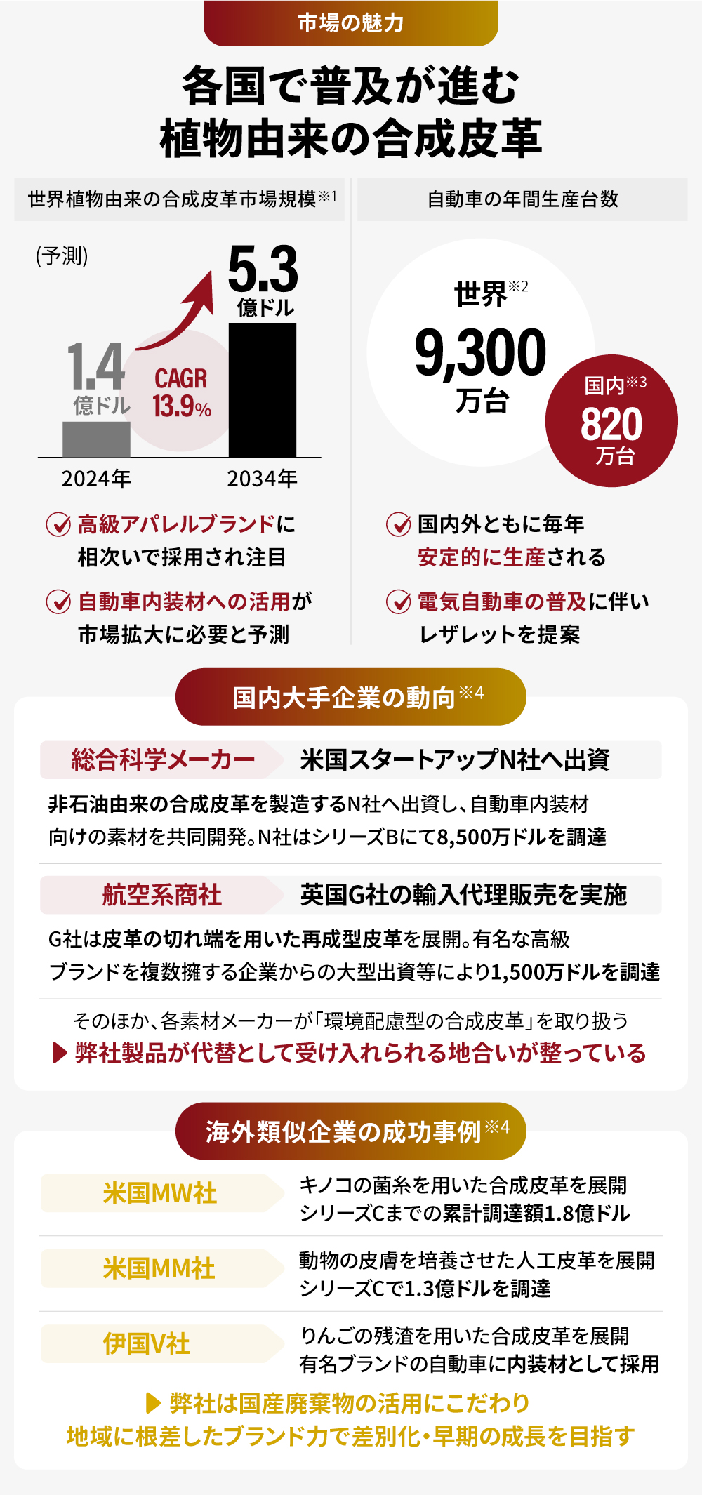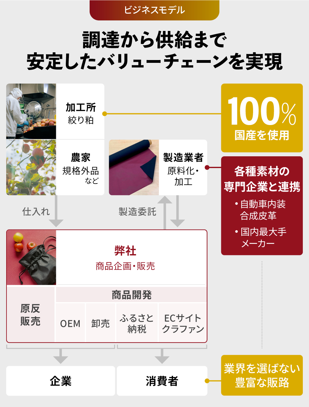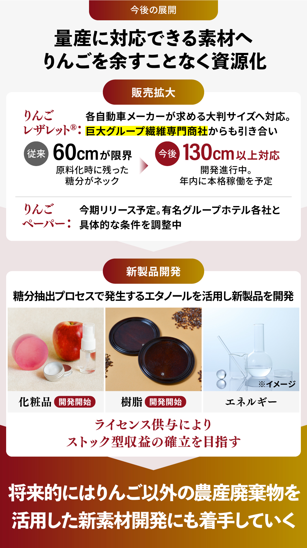 ãŸããå°æ¥çã«ã¯ãã¶ã©ããæ¿ãªã©ãããã以å€ã®èŸ²ç£å»æ£ç©ã掻çšããæ°çŽ æéçºã«ãçæãå°åç¹ç£åãæŽ»ããããå°ç£çŽ æããæ žã«å šåœå±éãé²ããªãããM&Aã«ããEXITãç®æããŠããŸãã