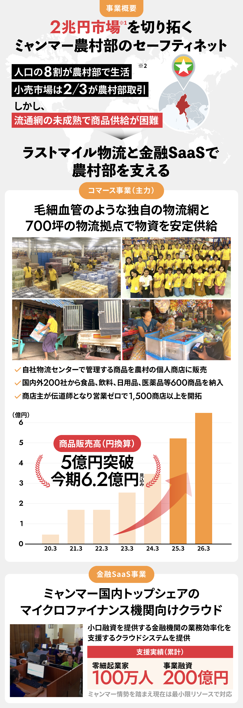 ミャンマー農村部約67,200村のうち687村(カバー率約1.0%)に営業エリアを拡大する計画です。農村部で154人を雇用し、年間約69,500件の配送により約8.9億円の商品販売を目指します。地域の金融機関と提携して、契約商店向けの融資サービスを提供する計画です。ミャンマー全国にマイクロファイナンスSaaS事業のパートナー機関があり提携可能であると考えています(事業計画には本施策による売上増は織り込んでおりません)。