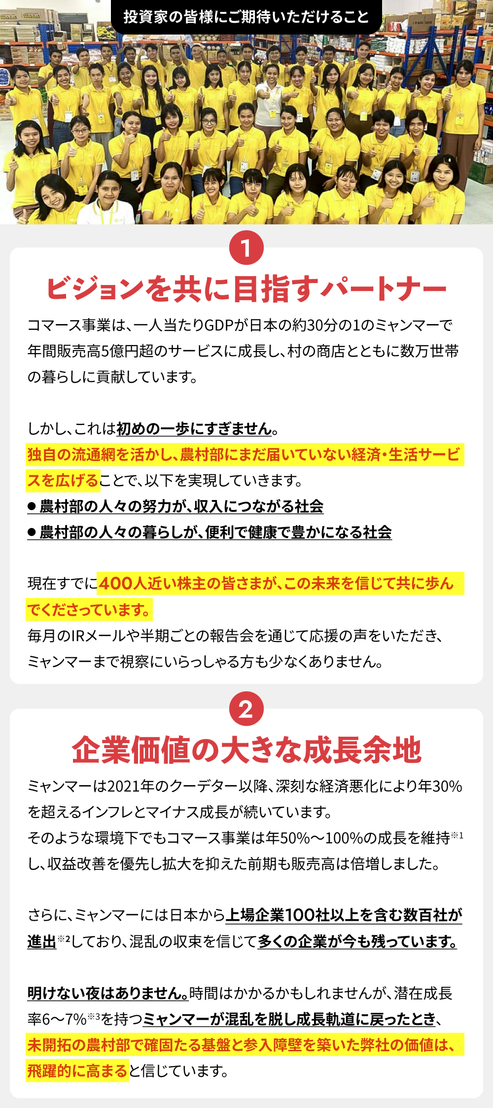 ミャンマーでは2021年にクーデターが発生、事業継続の危機に直面しました。高まったカントリーリスクの中でも、約400名の個人投資家の方々がビジョンに共感し、事業の可能性を信じて参加頂き、今も拡大を続けることができています。