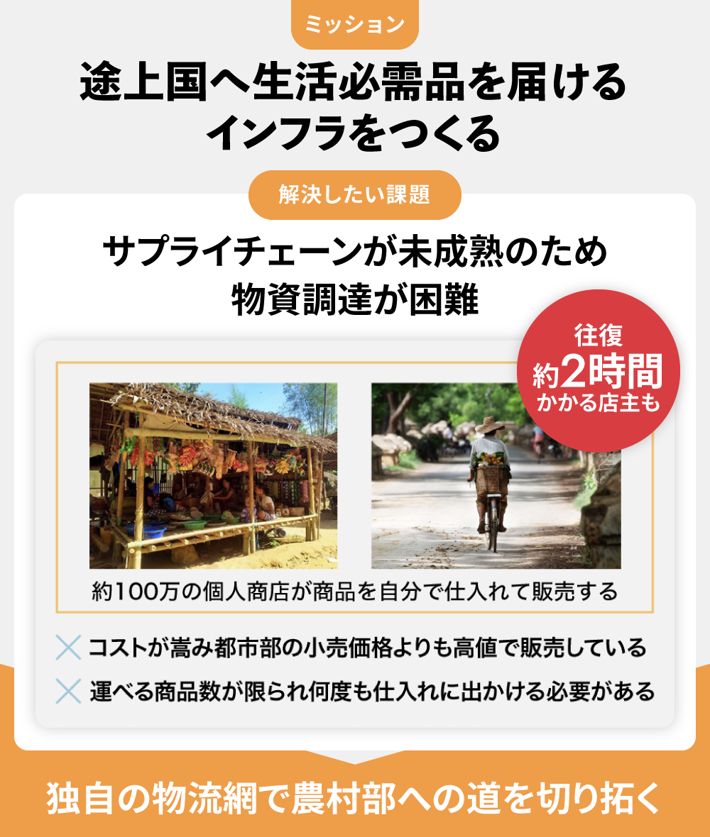 その個人商店は、ある共通の課題を抱えています。それは仕入れの問題です。農村部に商品を供給する物流インフラがなく、例えば、商店主は毎週1~2回、往復約2時間もかけて街に仕入れに行かなければなりません。