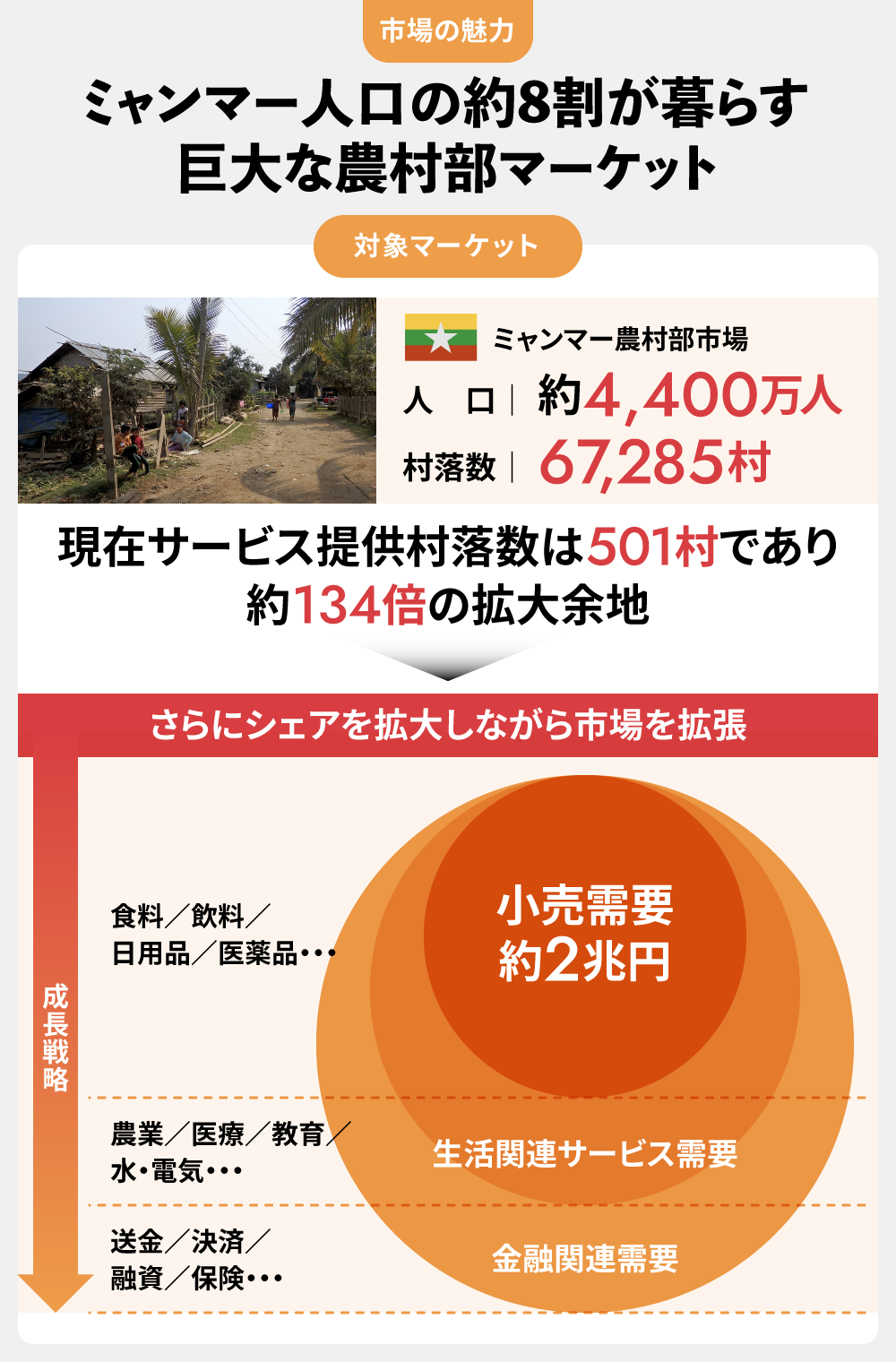 ミャンマーは、人口の約8割(約4,400万人)が農村部で生活しており、農村部の小売市場は年間約2兆円規模と推測されています(出典:ミャンマー国勢調査2015年、国連世界人口推計、統計局、大和総研「アジア小売市場の実態調査」より試算)。