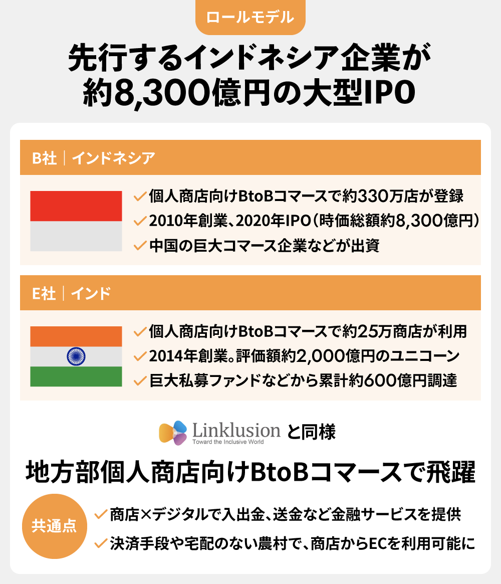 新興国にてB2Bコマース事業者が躍進。創業10年で時価総額約8,300億円で上場※2したベンチャーの他、数百億円単位の資金調達や世界的EC・小売企業との提携も見られる※3
