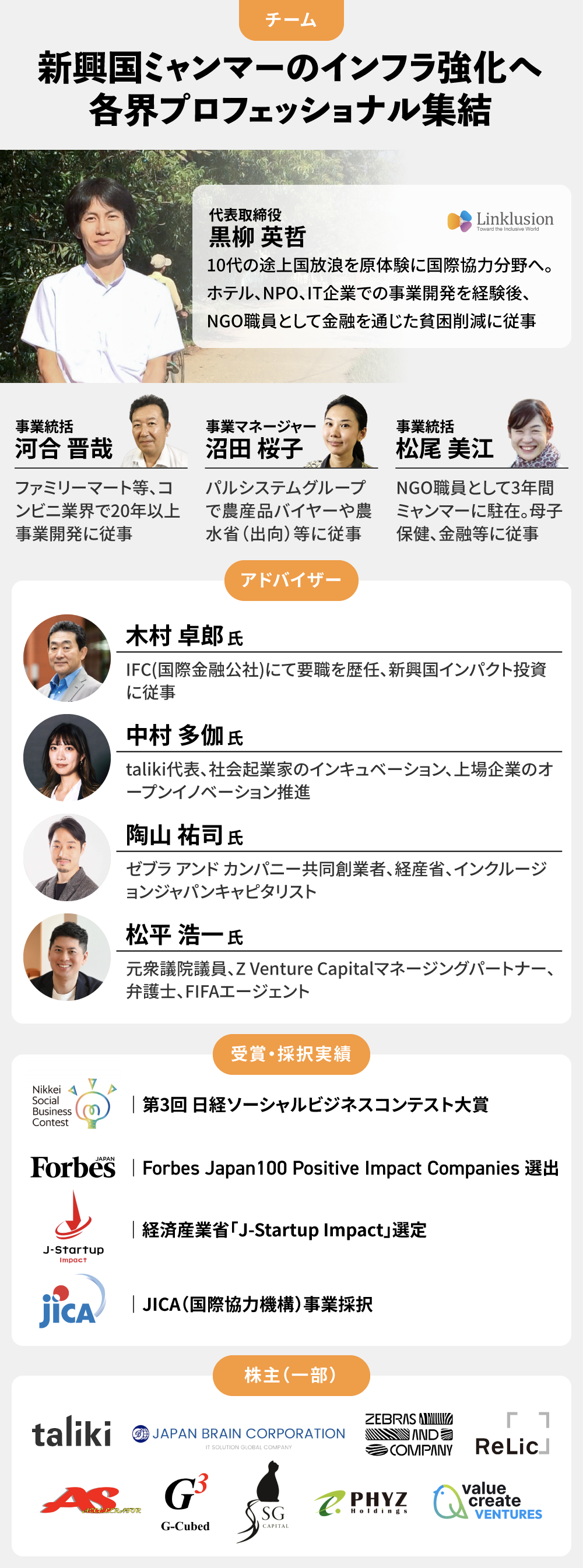 リンクルージョンさんのビジネスモデルとビジョンは大変に壮大です。正直、気の遠くなるような構想に感じてしまう事もあります。しかし、経営者の黒柳さんから現場のスタッフまで、人々の生活が便利になるよう、目を輝かせながら日々の仕事をされています。いまのミャンマーの経済状況で企業は事業継続すら難しい中、リンクルージョンが年50%を超える成長を続けていることは驚異的です。何度か事業現場に足を運ばせて頂きましたが、農村部に根差したサービスと洗練されたオペレーションに感動します。