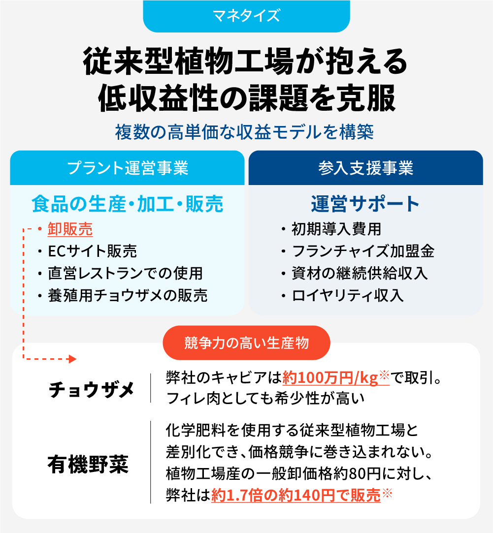 従来の植物工場は電気代を中心として運営コストが高く、収益性が低い点が課題でした。弊社は効率的な生産システムに加え、高付加価値のチョウザメと、有機の葉物野菜を組み合わせることで高い収益性を実現しています。