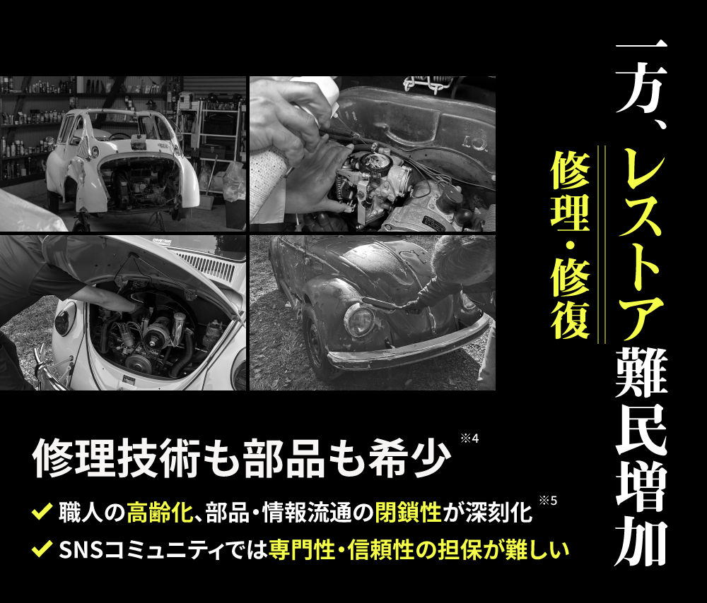 カーレストアは想像以上に高度で手間のかかる作業です。1台あたり数万点を超える部品が精密に組み合わされており、溶接、塗装、電装など多岐にわたる技術を要します。そうした中で、部品の廃盤や職人の高齢化、修理工房の減少(出典:Hagerty「The restoration crisis is building」)により、リアルなコミュニティの維持も難しくなっています。