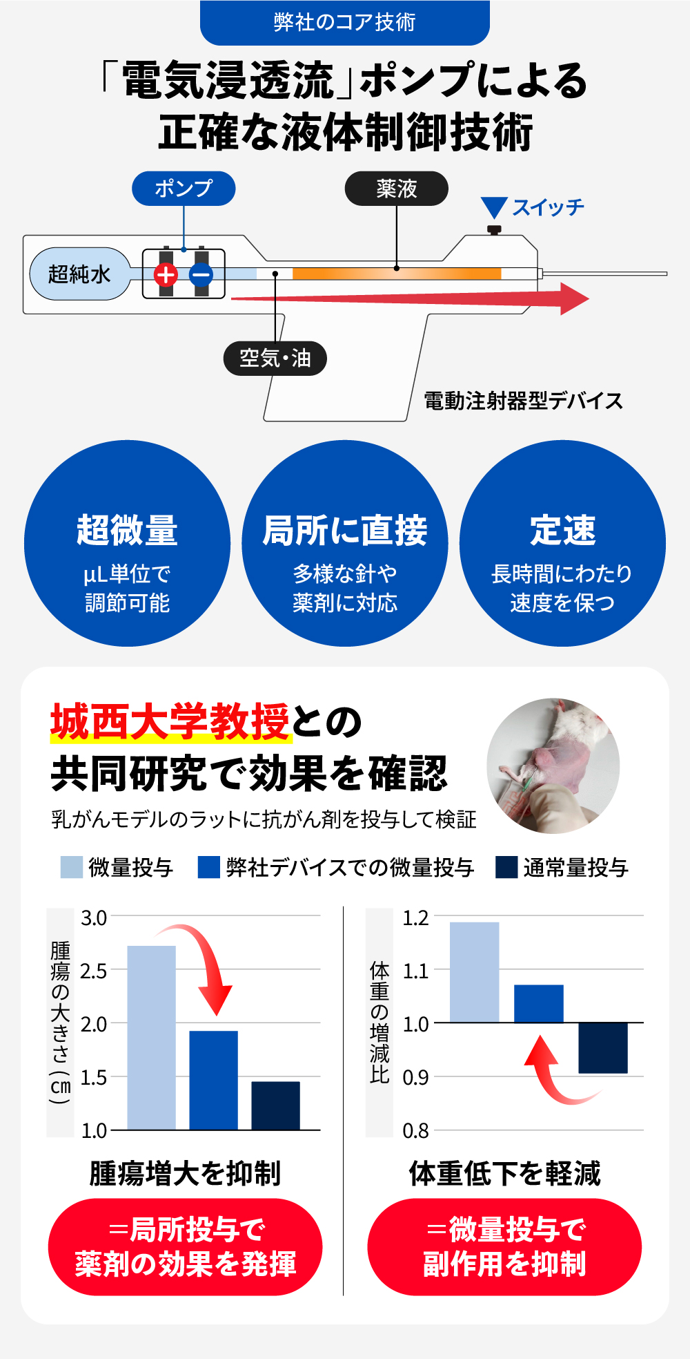 åŒç€Ÿã¯ãã®èª²é¡ã«å¯Ÿããå®äŸ¡ãã€é«ç²ŸåºŠãªæè¬æè¡ã§ãæ£è ããçæŽ»ã諊ããã«æ²»çã§ãã瀟äŒããå®çŸããããšãç®æããŠããŸããåŒç€Ÿäºæ¥ã®æ žãšãªãæè¡ã¯ã黿°æµžéæµãšããç©ççŸè±¡ãå¿çšããè¶ å°åãã³ãã§ããé»å§ã«ãã£ãŠæ¶²äœã®æµããå¶åŸ¡ãã以äžã®3ã€ã®ç¹æ§ãå®çŸããŸããã