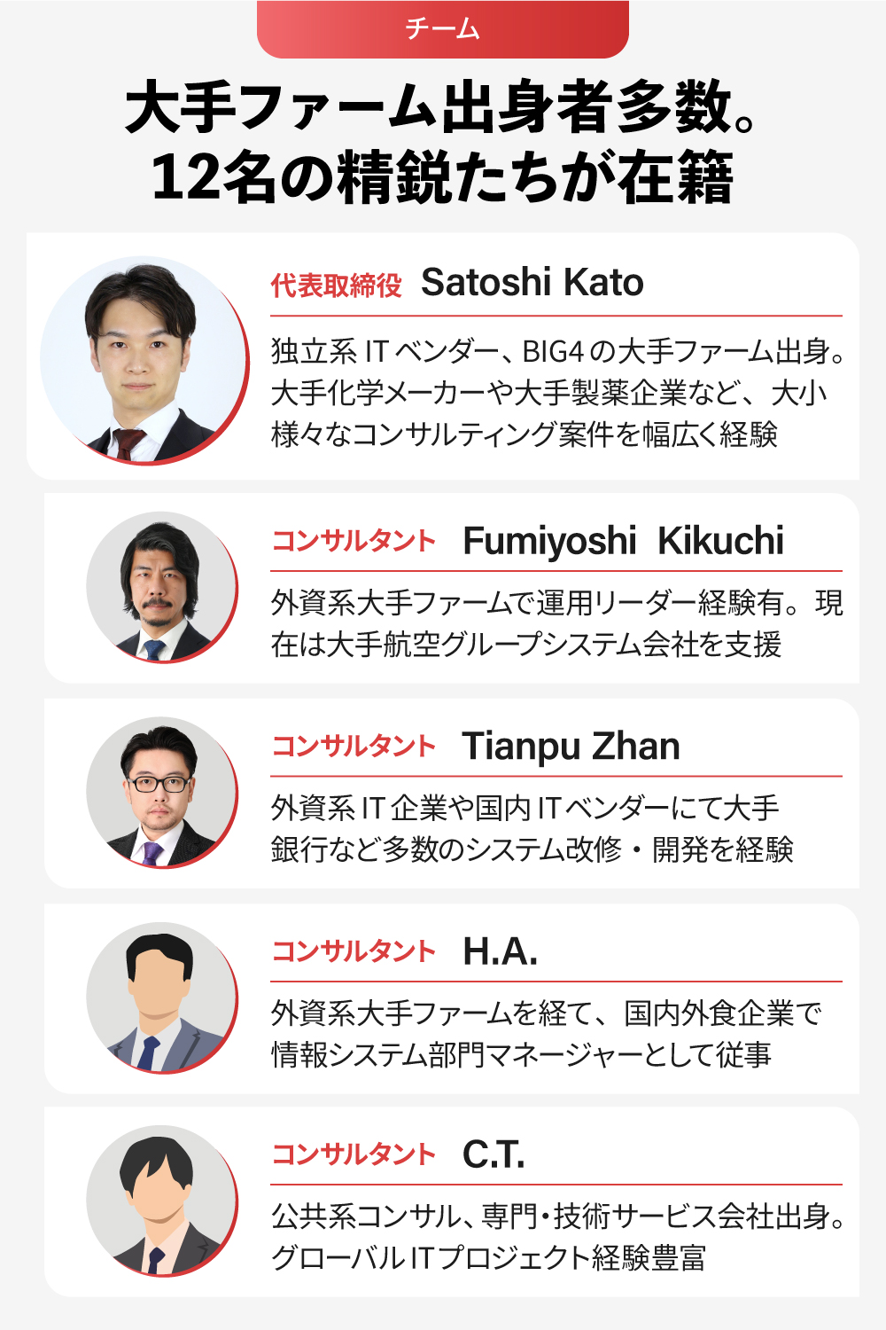 代表の加藤は、BIG4と呼ばれる大手外資系コンサルティングファームにて、これまで大手化学メーカーや大手製薬企業をはじめとして、数々のシステムコンサルティング案件に参画した経験を持ちます。現行システムのライセンス切れに伴う構想策定や、人事評価制度刷新と並行したシステム再構築など、上流工程から下流工程、大規模から小規模な案件まで幅広く経験してきました。