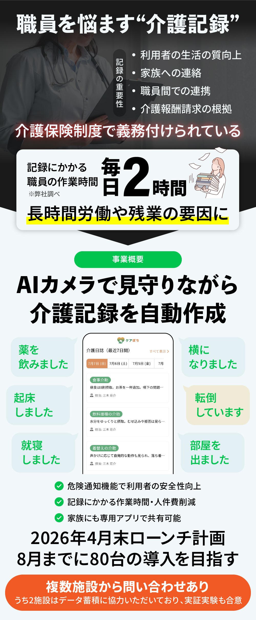 弊社は、介護向けAI見守り通知システム『ケアぽち』を開発しています。これは、AIがカメラ映像を解析し、利用者の転倒や起床などの行動を検知・通知する機能に加え、その行動内容を言語化し「介護記録」を自動で作成する点が特徴です。