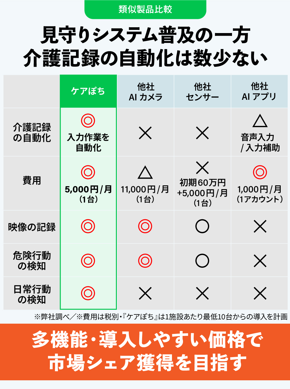 この技術革新により、AIカメラを使用した他社製品が月額数万円〜のコストを要する中※1、『ケアぽち』は1台5,000円(税別)という低価格を実現しました※2。現場が使いやすい機能と運営コストを追求できる点が弊社の最大の強みだと自負しています。