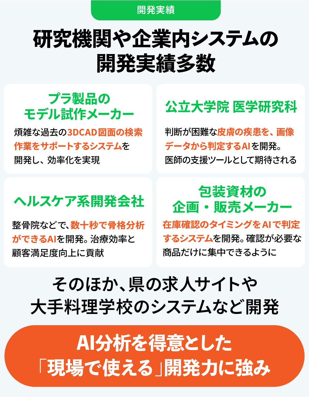 これまでには、公立大学の大学院医学研究科への「AI皮膚画像自動診断アプリケーション」の開発や、ヘルスケア会社への「AI姿勢測定・骨格分析システム」の提供などの開発案件で多数の実績を上げ、研究機関や企業から高い評価をいただいていると自負しています。