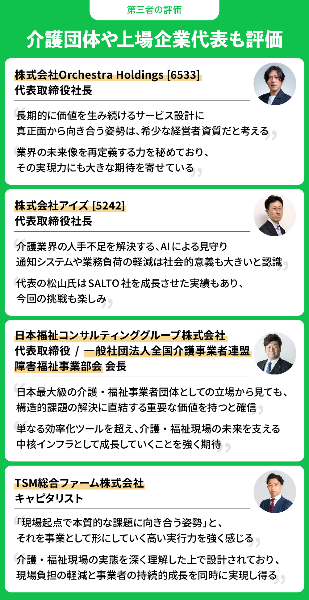 日本最大級の介護・福祉事業者団体としての立場から見ても、御社のサービス『ケアぽち』は、業界が長年抱えてきた構造的課題の解決に直結する極めて重要な価値を持つと確信しています。