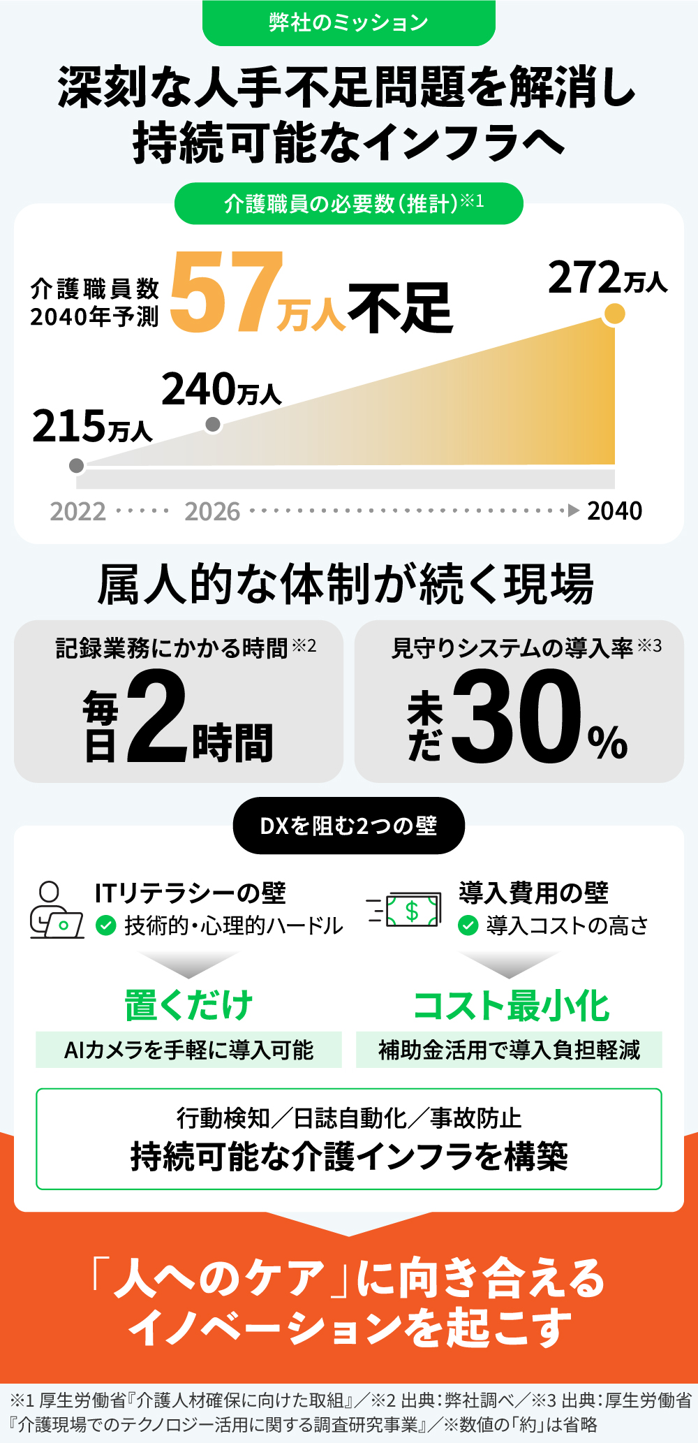 これら課題に対し、弊社は「カメラをつけるだけ」で介護記録が記録でき、補助金を活用した導入コストの最小化により解決を図ります。スタッフが本来注力すべき「人へのケア」に向き合える環境を作り、人手不足の解消とケアの質向上を同時に実現する、持続可能な介護インフラの構築を目指します。