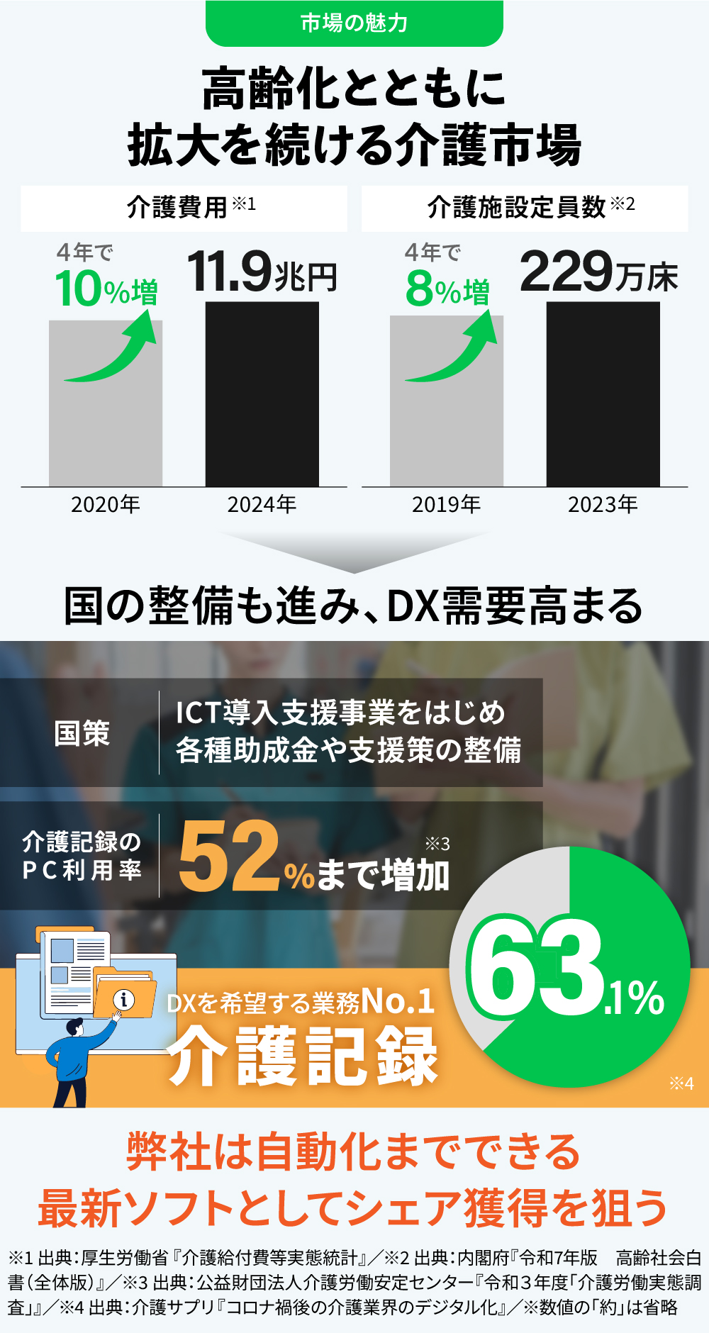 さらに、少子高齢化という日本最大の社会課題に対していち早くDXを取り入れ、介護現場の負担を減らし、将来的には介護職に希望を抱く方々が増える未来の実現に貢献してまいります。