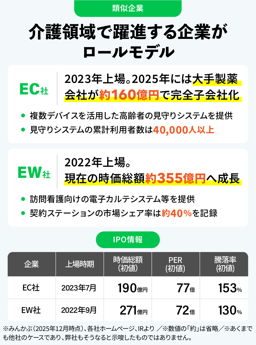 包括的な見守りサービスを手がけるEC社がロールモデル。2023年上場・2025年大手製薬会社が約160億円で完全子会社化※2