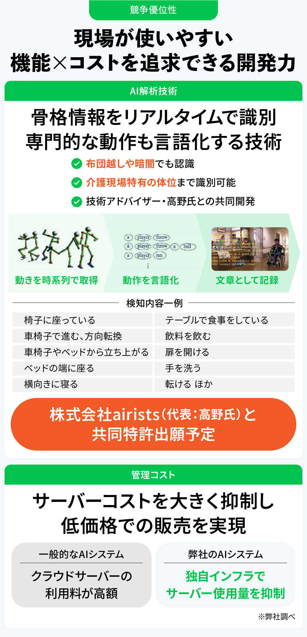 弊社は、AI・データ分析と、それを実用的なサービスに落とし込むシステム開発力を併せ持っており、技術をもとにした社会課題の解決を目指しています。この点も、他の見守りシステム開発会社と異なる優位性であると考えています。