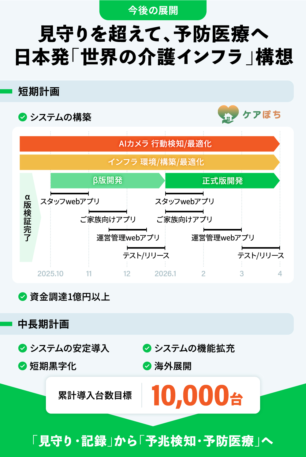 『ケアぽち』の検証を終えて2026年4月末のローンチを予定しており、8月までに80台の導入を目指します。