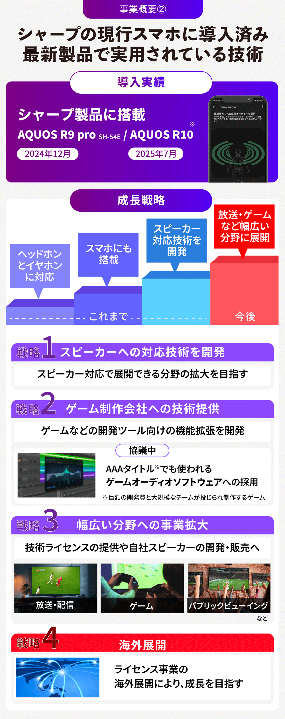 あわせて、放送・配信向けのシステム提供やサウンド制作支援などを通じて営業面の強化を図り、ライセンス事業の拡大を目指します。将来的にはアジア圏や欧米市場への展開も視野に入れ、新技術に関する特許取得に取り組んでいく方針です。