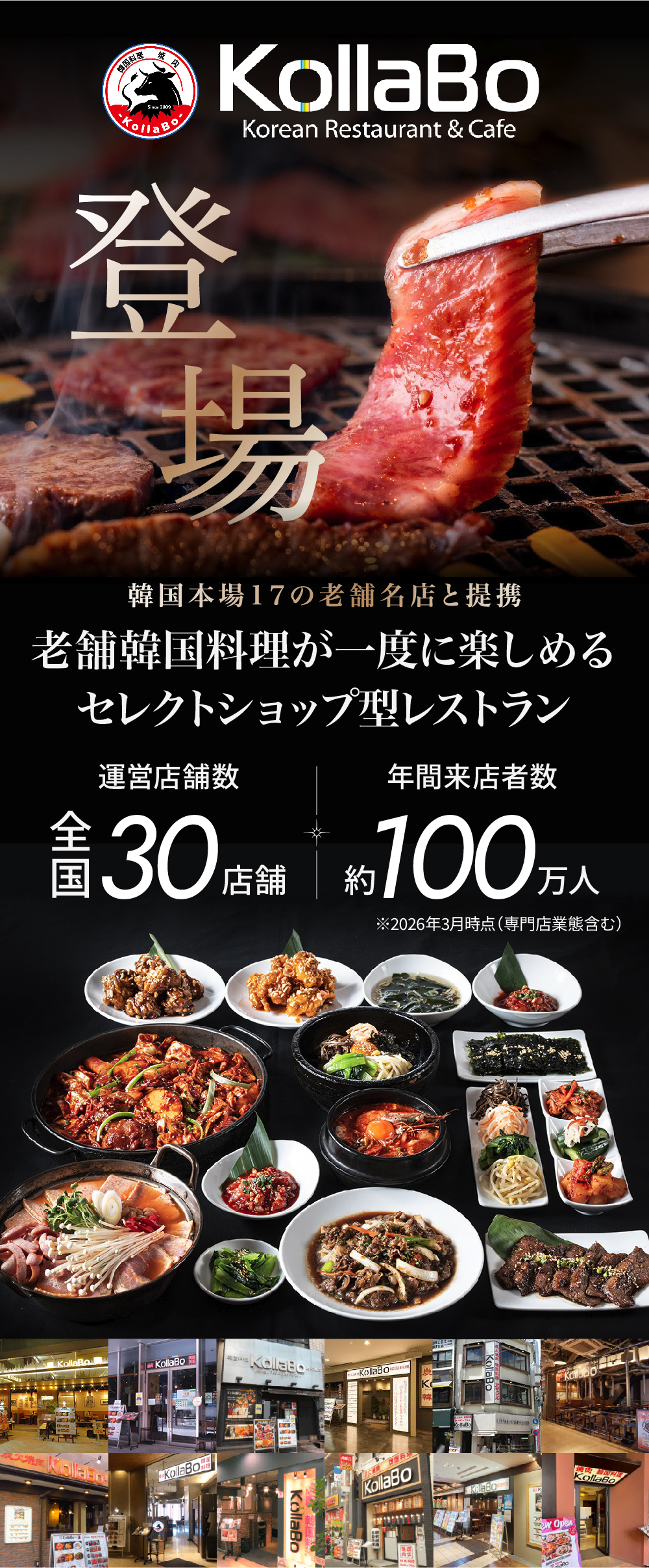 弊社は、韓国本場の老舗名店17ブランドと提携し、それぞれの看板メニューを一つの店舗で楽しむことができる韓国料理・焼肉レストラン「KollaBo(コラボ)」を展開しています。現在、日本全国に30店舗(専門店業態含む)を展開し、年間約100万人のお客様にご利用いただいています。