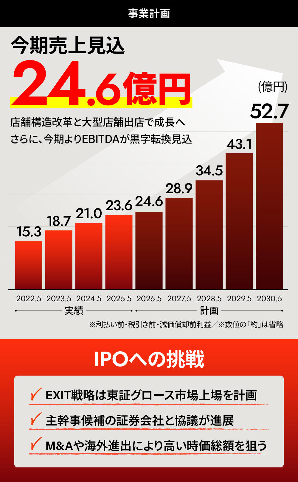 2025年5月期の売上高は約23.6億円を達成。今期は財務状況の改善を背景に新規出店を増やし、売上高約24.6億円(前期比約105%)への成長を見込んでいます。