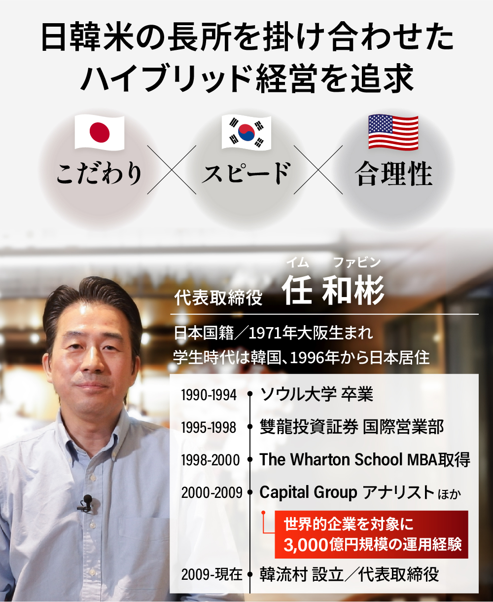 金融の第一線でキャリアを築いてきた任が飲食業へ転身した背景には、世界の一流企業経営者との交流を通じて培った問題意識がありました。韓国料理には世界に通用する魅力があるにもかかわらず、世界的に展開するグローバルブランドが存在していないことに着目し、この領域に大きな事業機会を見出したことから、2009年に韓流村を設立しました。
