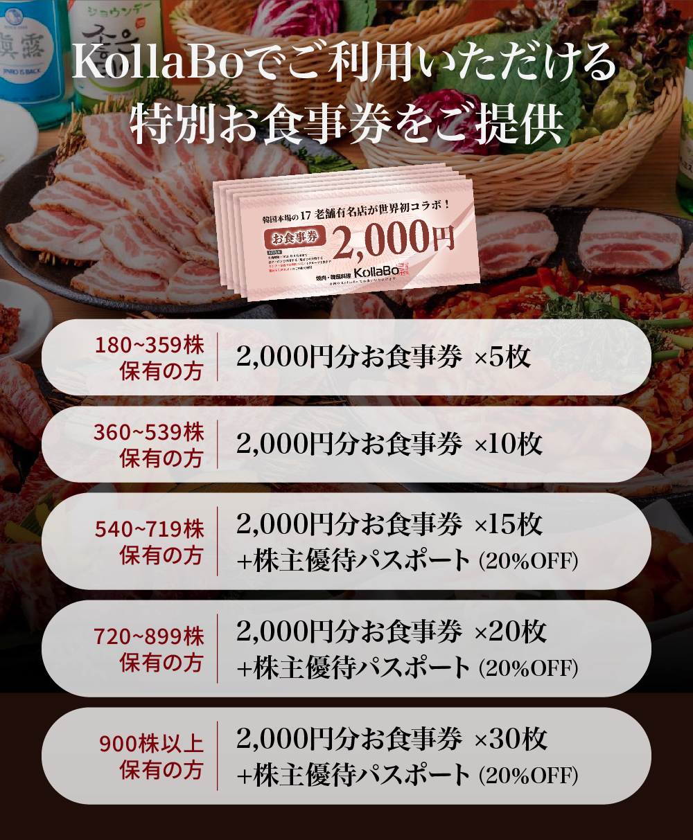 弊社では、株主の皆様からのご支援に感謝するとともに、より多くの方に「KollaBo」にて韓国本場の料理をお楽しみいただくための優待サービスを提供しております。詳しくはこちらからご確認ください。