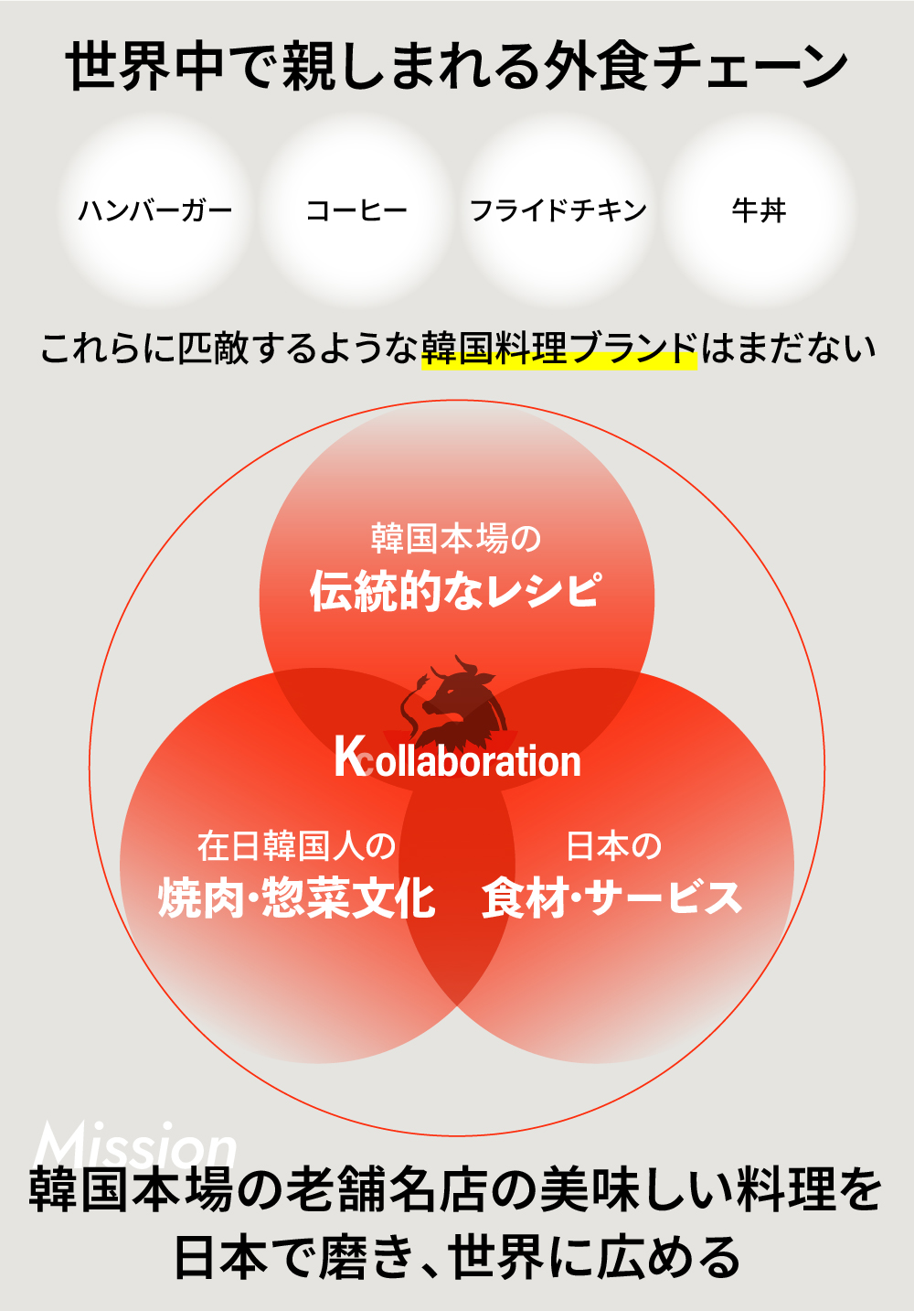 ハンバーガーやコーヒー、フライドチキンなど、世界を見渡せば食文化を牽引する巨大なグローバルブランドが数多く存在します。しかし、韓国料理においては、それらに匹敵する世界的ブランドは未だ存在していないと考えています。