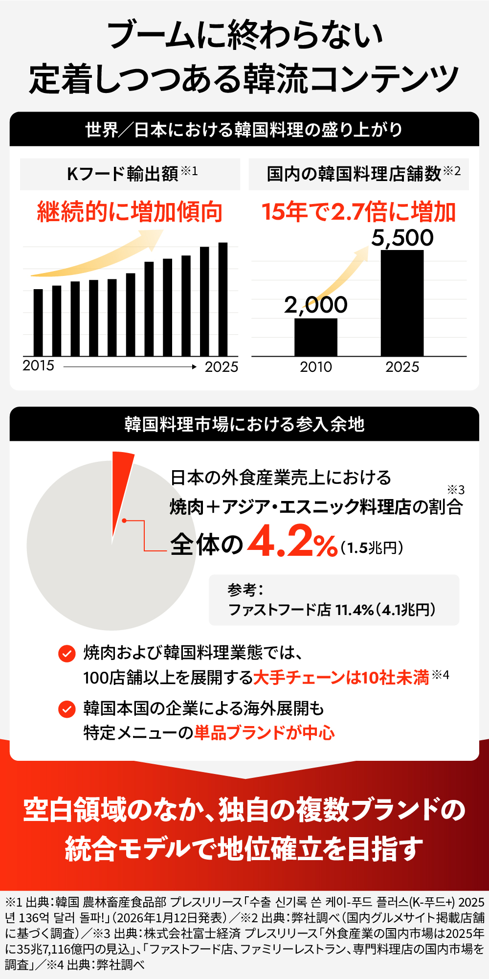 外食においても、国内の韓国料理店数は2010年の約2,000店舗から2025年には約5,500店舗へと増加し、およそ15年で約2.7倍の成長を記録しました※3。一方、日本の外食市場は2025年に約35.7兆円規模になると見込まれている中、焼肉を含むアジア・エスニック料理店の市場規模は約1.5兆円(全体の約4.2%)に留まっています※4。市場全体と比較すると、韓国料理分野には依然として大きな成長余地があると考えています。
