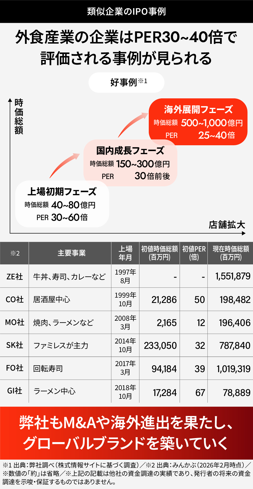 外食産業の企業は、店舗数の拡大に伴って売上と利益が成長しやすいビジネスモデルであることから、株式市場では比較的高いPER(株価収益率)で評価されるケースが見られます。実際に、IPO時点で30~80店舗規模の外食産業の企業は、PER30~60倍程度で評価され、時価総額40~80億円でスタートする事例もあります※。