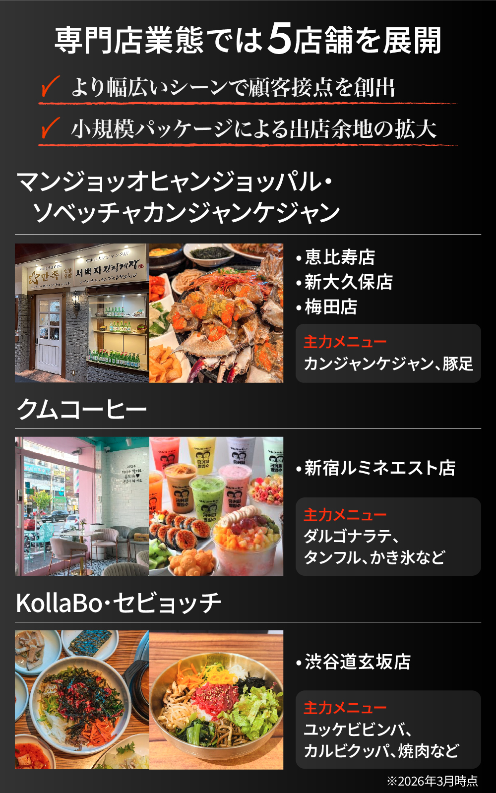 これらの専門店業態は、「KollaBo」のセレクトショップ型モデルとは異なり、専門店という分かりやすい形で提供することで、より幅広いシーンで顧客接点を創出する狙いがあります。さらに、「KollaBo・セビョッチ」はこれまでレストラン型では出店が難しかったフードコートや、デリバリー・テイクアウトに特化した小規模パッケージでの出店も可能であり、出店余地の拡大にもつながると考えています。