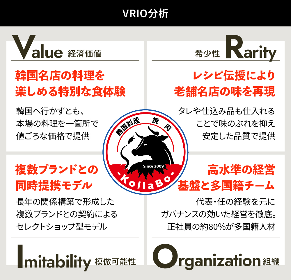 韓国老舗店舗との長年にわたる信頼関係とブランド使用契約は、資本力だけで模倣できるものではありません。代表の任が自ら韓国各地の老舗へ幾度も足を運び、時間をかけて関係を築いてきました。単一店舗とのコラボレーションであれば他社でも実現可能ですが、17店舗との規模で同時に契約を維持することは容易ではなく、こうしたブランドネットワークと高度なオペレーションを要するビジネスモデル自体が高い模倣障壁になると考えています。