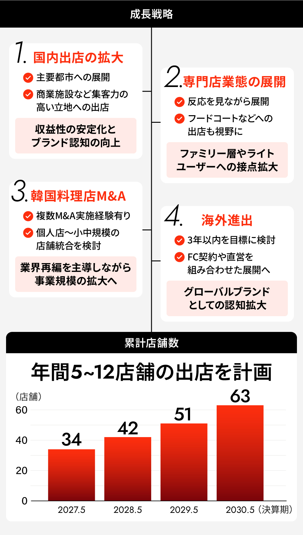また、事業承継の課題を抱える個人店や、10~15店舗規模の韓国料理チェーンの積極的なM&Aを検討しており、業界の再編を主導しながら事業規模の拡大を図っていきます。