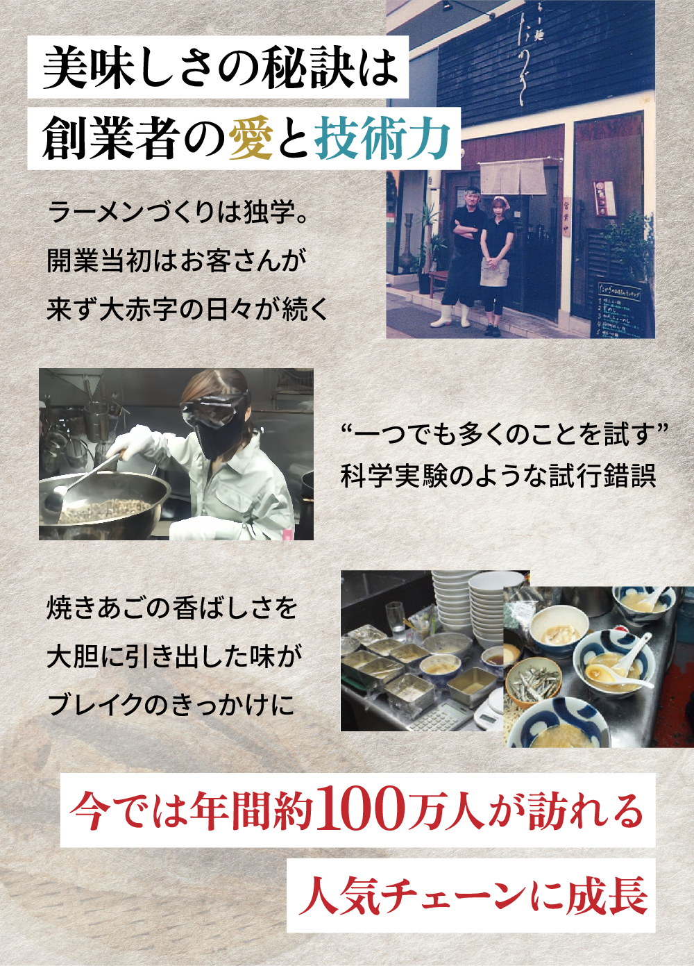 代衚ã®é«æ©ã¯æ°æœå€§åŠã忥åŸãäžåç£ããããããŒã«å°±è·ããŸããããåºç£ãæ©ã«éè·ããã®åŸããããäžåºŠããžãã¹ã®äžçã«æ»ãããããšããæ³ãããèµ·æ¥ã決æããŸãããæããŠããŸãªãå°å ã»æ°æœã®çŒãããæåãå šåœçã«åºãŸã£ãŠããªãããšã«æ°ä»ãã2011å¹Žã«æ±äº¬ã»èè·è°·ã§å°ããªã©ãŒã¡ã³åºã鿥ããããšããåŒç€Ÿã®å§ãŸãã§ãã