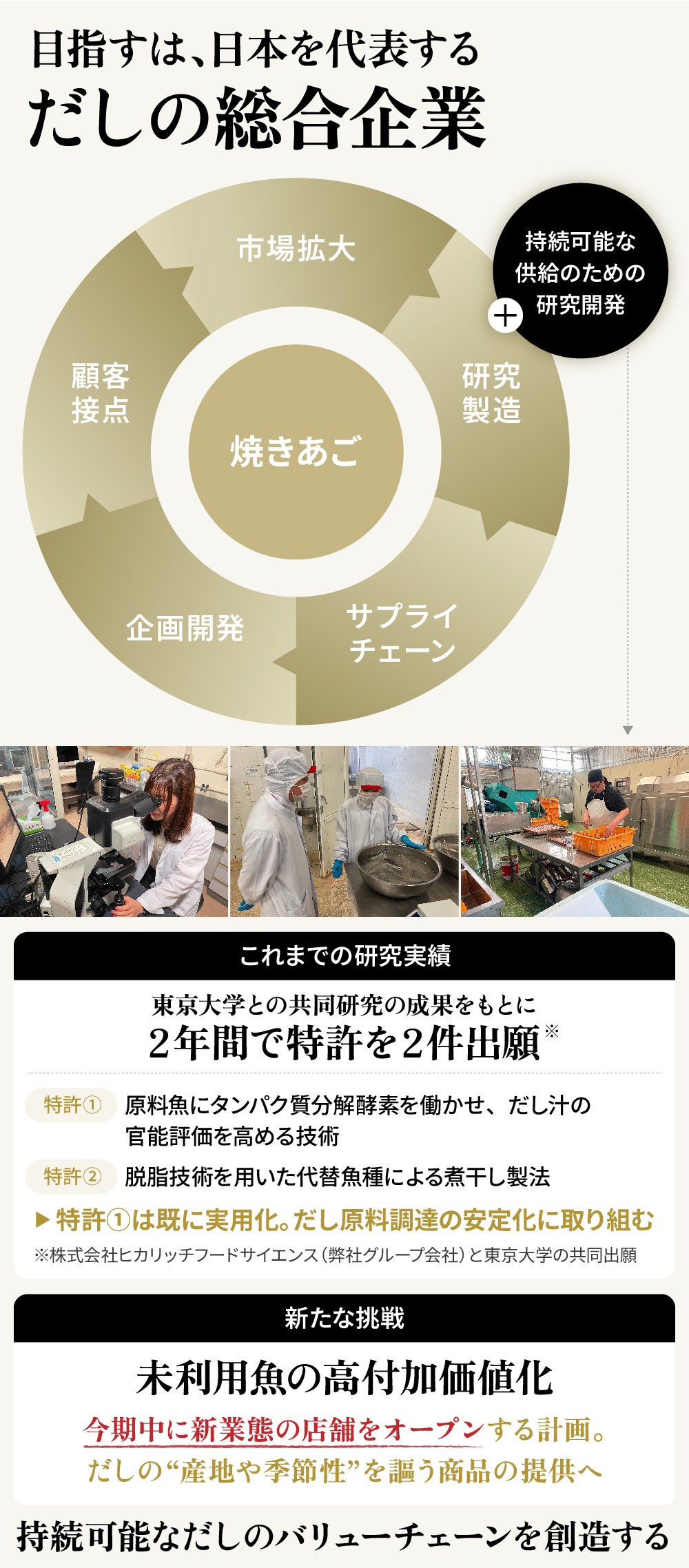 ããã«ãåŒç€Ÿã¯2022幎ãã2幎éã«ããããæ±äº¬å€§åŠ å€§åŠé¢ 蟲åŠçåœç§åŠç ç©¶ç§ å€§è¥¿åº·å€«ææãšé µçŽ ãçšããæ°Žç£å å·¥æè¡ã«ã€ããŠå ±åç ç©¶ãè¡ãããã®ææãšããŠç¹èš±2ä»¶ãå ±ååºé¡ããŸããããã¡äžèšãç¹èš±â ãã¯ãçŸåšãã°ã«ãŒãäŒç€Ÿ æ ªåŒäŒç€Ÿãã«ãªããããŒããµã€ãšã³ã¹ïŒHFSïŒã®è£œé çŸå Žã§å®çšåãããŠãããä»ç€Ÿã®åæèª¿éç¶²ãšç«¶åããªãæ°ããªäŸçµŠæºãçã¿åºãããšã§ãæç¶çäŸçµŠãžã®æåŸ ãæãŠãŸãã