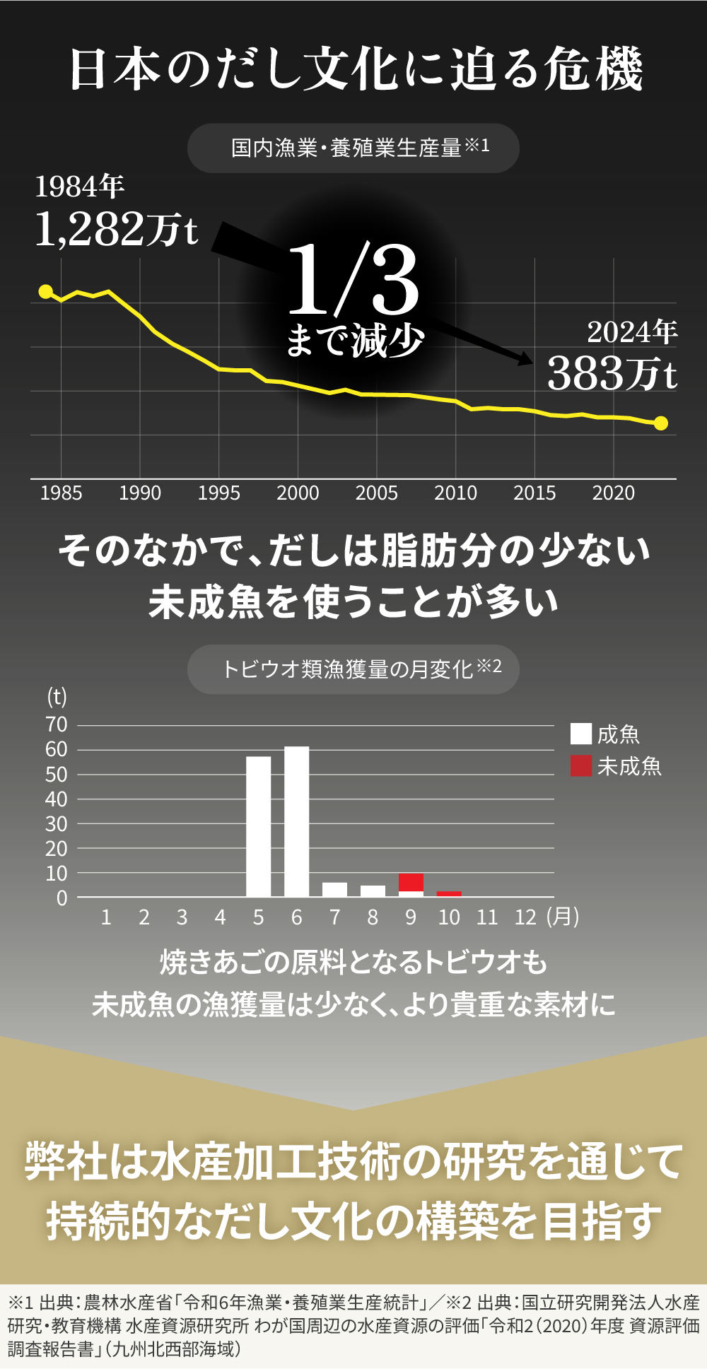 äžæ¹ãæ¥æ¬ã®æŒæ¥ã»é€æ®æ¥çç£éã¯1984幎ã®çŽ1,282äžãã³ãããŒã¯ã«æžå°ãç¶ãã2024幎ã«ã¯çŽ383äžãã³ãšãããŒã¯æã®çŽ3åã®1ã«ãŸã§èœã¡èŸŒãã§ããŸãâ»1ãä¹±ç²ãæµ·æŽç°å¢ã®å€åãäž»ãªèŠå ãšãããæ°Žç£è³æºã®æç¶çãªå©çšã¯åœå šäœã®éèŠãªèª²é¡ãšãªã£ãŠããŸããå ããŠãéä»ã ãã®å質ã¯äžè¬çã«åæãšãªãéã®ãèã®å°ãªããã«å€§ããå·Šå³ãããŸãâ»2ããã®ããæ¥çã§ã¯ãèèªãèããåã®å°åã®ãæªæéïŒå¹ŒéïŒããéå®ãããŠãããè³æºã®æ¯æžãäŸçµŠäžå®ãšãã£ã課é¡ã«ã€ãªãã£ãŠããŸããçŒãããã ãããã®åœ±é¿ãåããè¿å¹Žã§ã¯ãã貎éãªçŽ æãšãªã£ãŠããŸãã