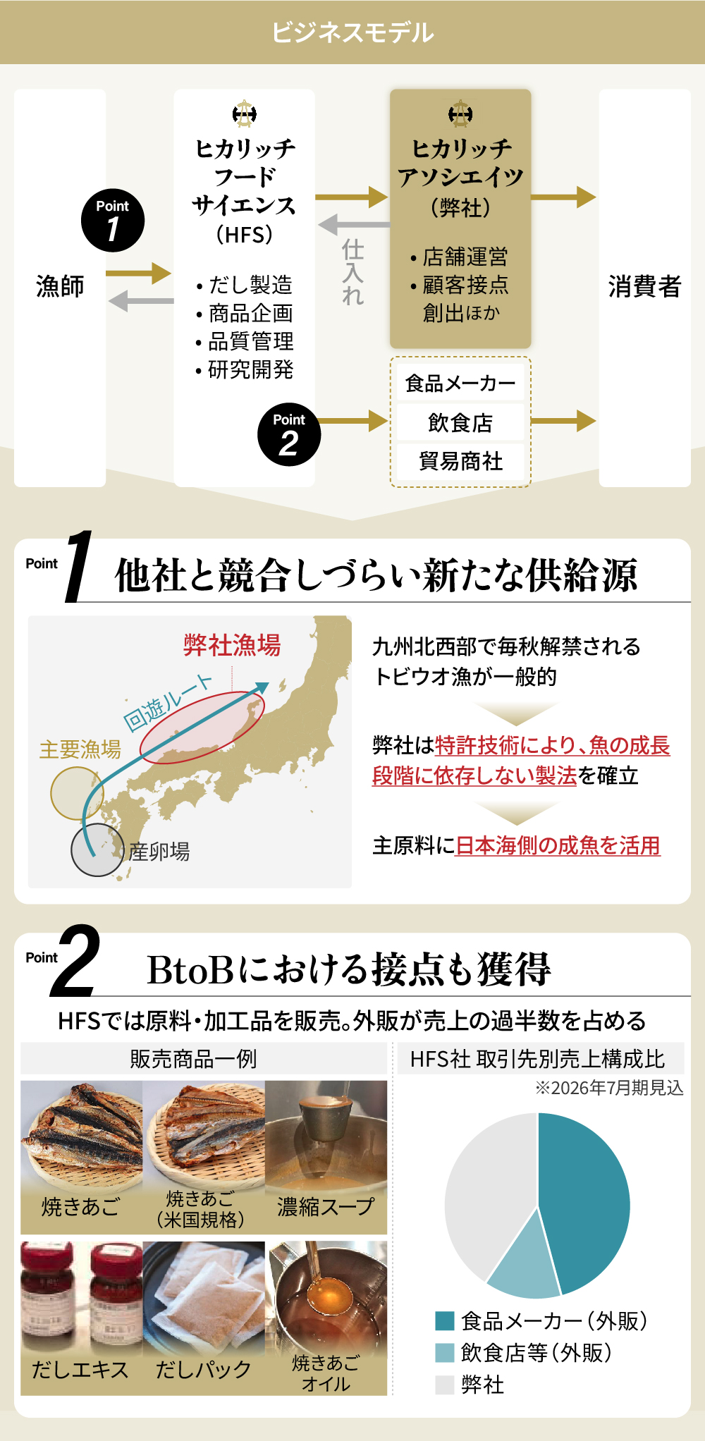 çŒãããã®åæãšãªããããŠãªã®èª¿éã«ãããŠã¯ãåè¿°ã®ç¹èš±ãçšããŠæéãæŽ»çšã§ããããšã§ãç«¶åãå°ãªãæ¥æ¬æµ·åŽã®ç¬èªã«ãŒãã確ä¿ã§ããŠããŸããã°ã«ãŒãäŒç€Ÿã§ããæ ªåŒäŒç€Ÿãã«ãªããããŒããµã€ãšã³ã¹ïŒHFSïŒã¯ãçŒãããã®è£œé ã»ååäŒç»ã»å質管çã»ç ç©¶éçºãæ ããé£åã¡ãŒã«ãŒãä»ç€Ÿã®é£²é£åºåãã«çŒãããåæãã ã補åã®å€è²©ãè¡ãããšã§ãBtoBã§ã®åçæ©äŒã確ä¿ããŠããŸããäžæ¹ã§ãåŒç€Ÿã¯HFSã®çŒããããä»å ¥ããåºèéå¶ãéããŠãåœå å€ã«åããŠé¡§å®¢æ¥ç¹ãåµåºããŠããŸãã