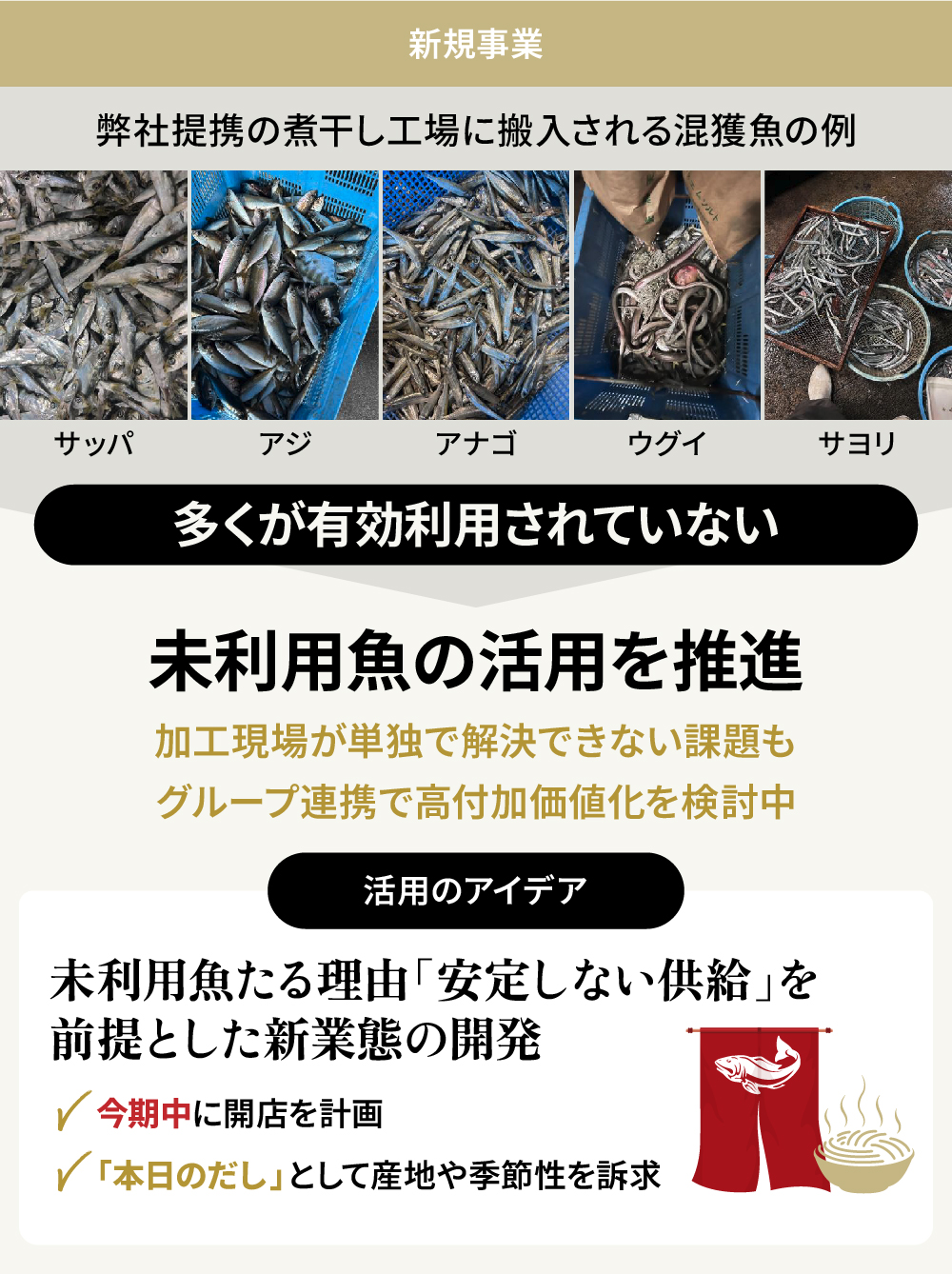 çŸåšãæ°ããªææŠãšããŠãæŒæ¥ã®çŸå Žã§çºçãããæªå©çšéã»æ··ç²éãã®åé¡ã«åãçµãã§ããŸããåŒç€ŸãçŒãããã補é ããé³¥åç墿ž¯ã®ååå·¥å Žã§ã¯ãç ®å¹²ãã補é ããŠããŸããç ®å¹²ãã®åæã§ããã€ã¯ã·ã¯çŸ€ãã§æŒç²ããããããã¢ãžãã¢ããŽããµãšãªãšãã£ãå€çš®å€æ§ãªéãæ··ãããŸããããã®å€ãã¯ããŒãºãå°ãªãããæå¹æŽ»çšãããŠããªãçŸç¶ã§ããåŒç€Ÿã¯ããã®æªå©çšéãã ãåæãå å·¥åãšããŠåååããããšã§ããããŸã§æªå©çšè³æºã«çµæžç䟡å€ãçã¿åºããããŒããã¹ã®åæžåã³æ°Žç£å å·¥æ¥è ã®æ°ããªåå ¥æºãåµåºããããšãç®æããŠããŸãã