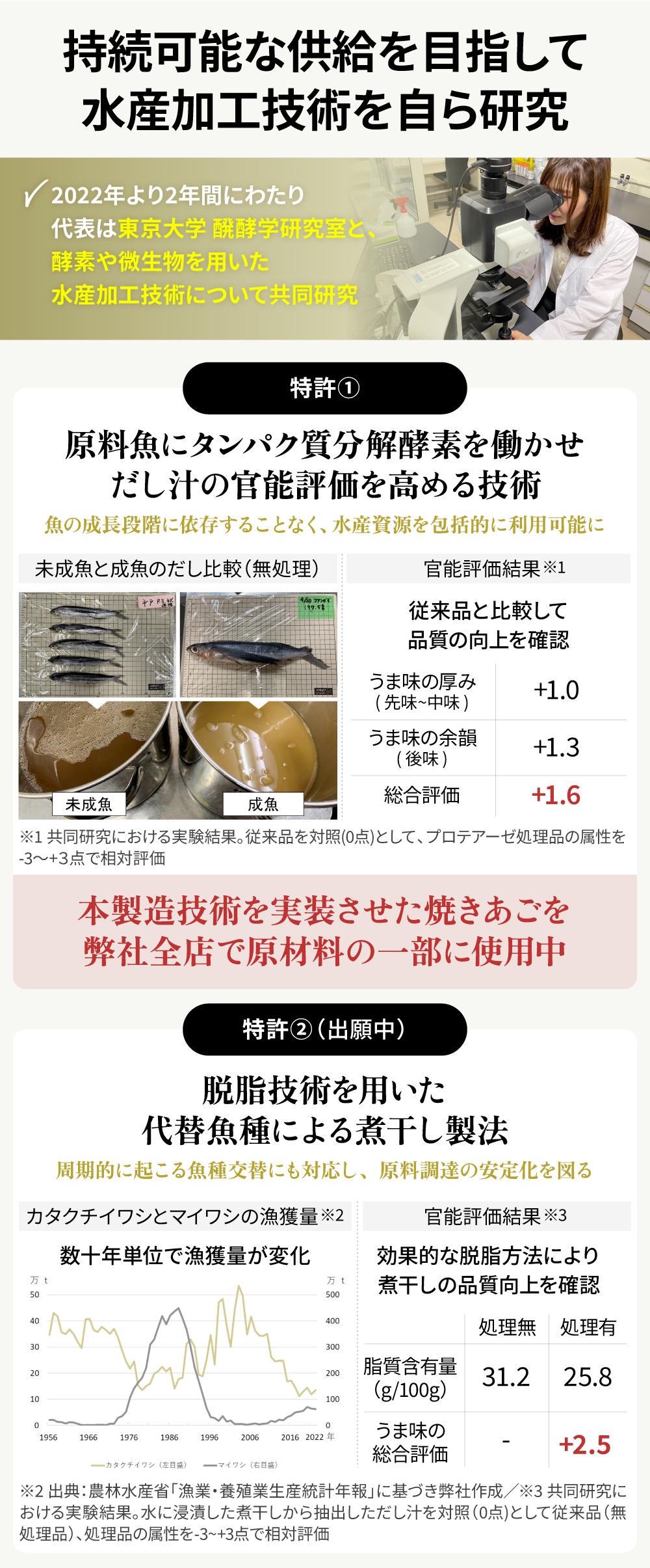 2022幎ãã2幎éã«ããããåŒç€Ÿã¯æ±äº¬å€§åР倧åŠé¢ 蟲åŠçåœç§åŠç ç©¶ç§ å€§è¥¿åº·å€«ææãšå ±åç ç©¶ãããé µçŽ ã埮çç©ãçšããæ°Žç£å å·¥æè¡ã®ç ç©¶ã宿œãâã ãâåæã«äžåããšãããèãæã£ã倧ããªéã§ãã麹èç±æ¥ã®ã¿ã³ãã¯è³ªåè§£é µçŽ ãæå¹ã«åãããããšã§ãã ãã®è©äŸ¡ãäžããç¬èªæè¡ãéçºããã®æè¡ã瀟äŒå®è£ ãããããšãç®çã«ã°ã«ãŒãäŒç€Ÿãæ ªåŒäŒç€Ÿãã«ãªããããŒããµã€ãšã³ã¹ïŒHFSïŒããèšç«ããæ±äº¬å€§åŠãšç¹èš±ãå ±ååºé¡ããŸããïŒç¹èš±ç¬¬7632834å·ïŒã