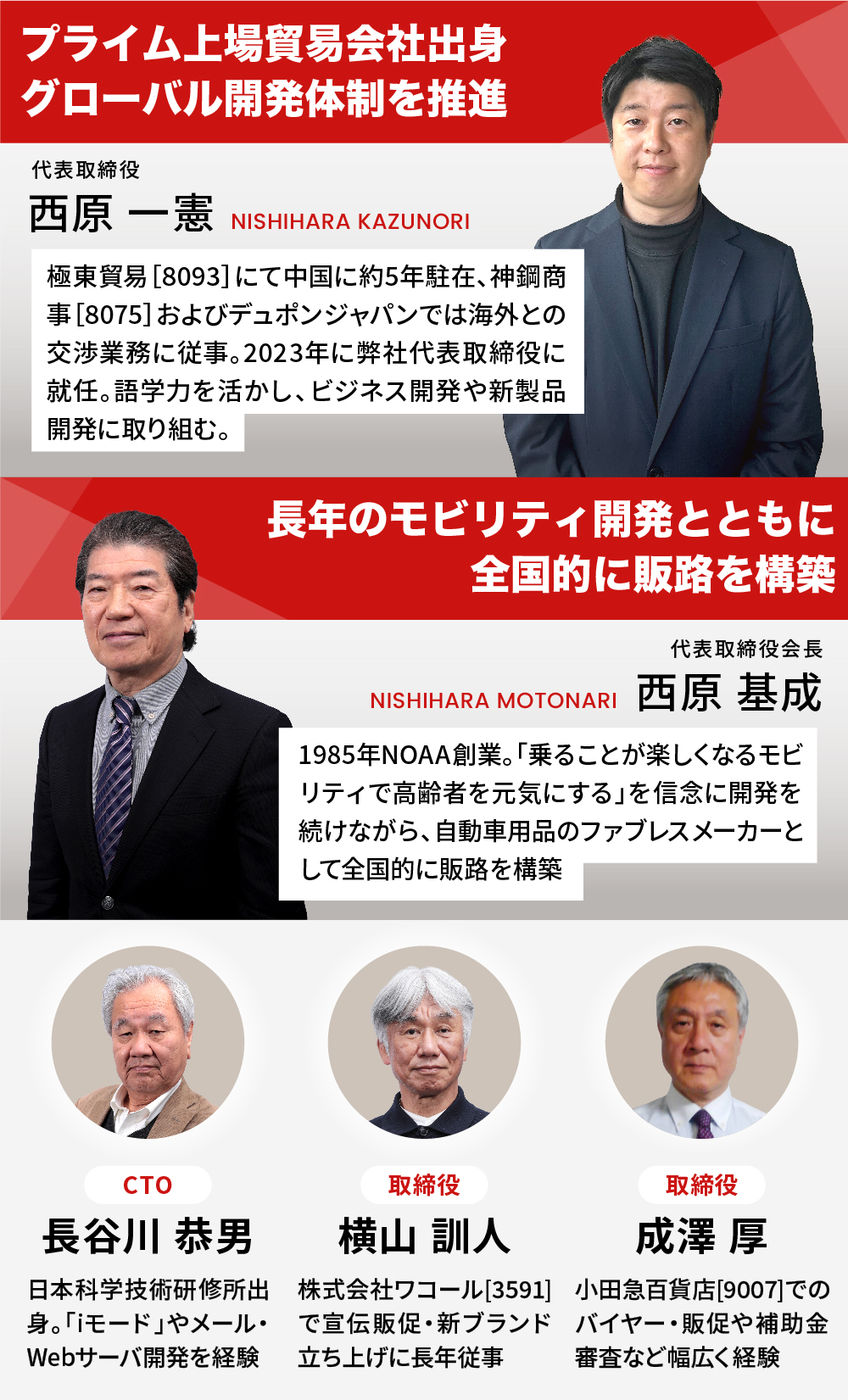 代表取締役会長の西原基成は、自転車部品卸問屋での営業経験を基に弊社を設立しました。若者の自動車離れという市場変化を先見し、後に電動乗物の開発を本格化。同時に、自動車用品のファブレスメーカーとして全国に販路を拡大し、事業基盤を構築してきました。息子である西原一憲は極東貿易株式会社[8093]、神鋼商事[8075]、デュポンジャパン株式会社(世界的化学メーカー デュポンの日本法人)勤務を経て実績を積み、満を持して2023年より代表取締役に就任しました。