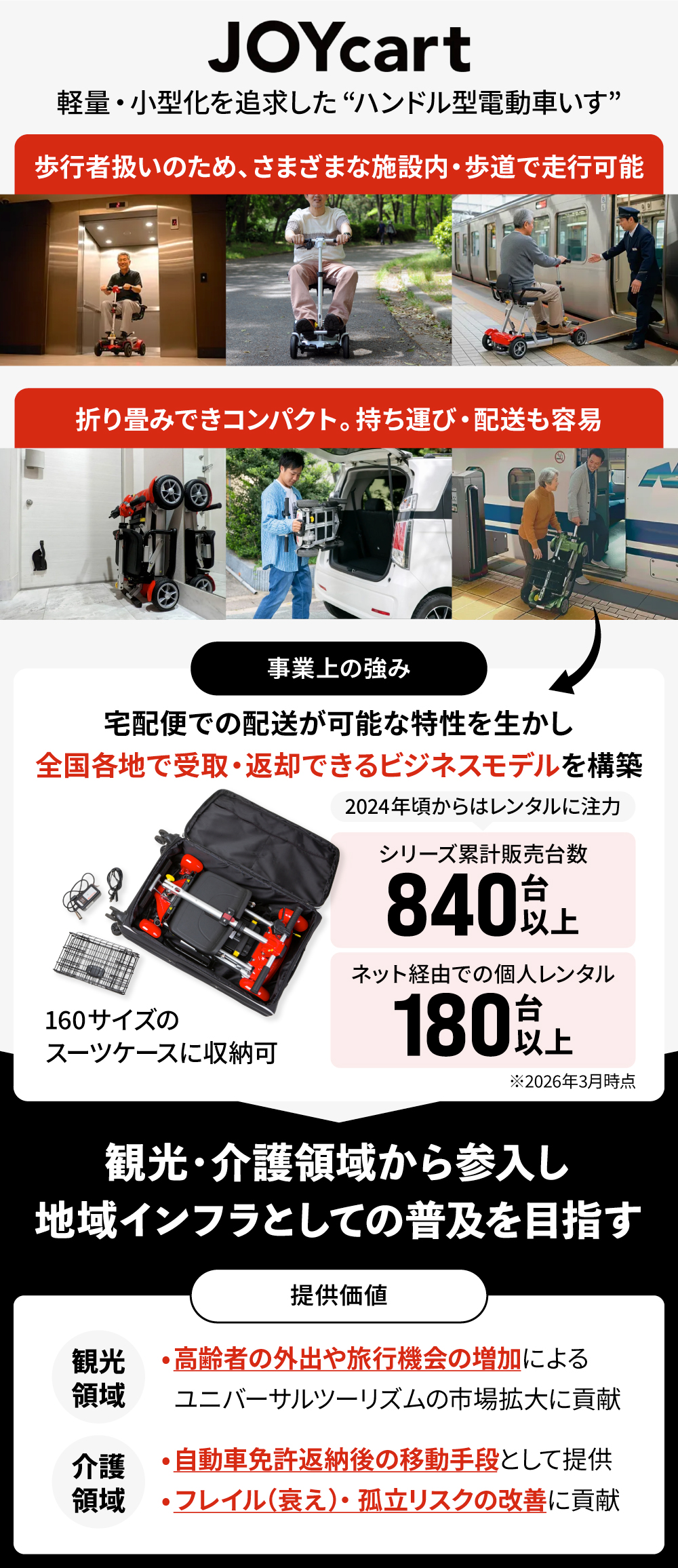 2020年頃から本格的な販売活動を開始し、2024年からはレンタルサービスでの提供に注力しています。「JOYカート」は160サイズ相当のスーツケースに収納でき、宅配便での配送が可能です。この特性を生かし、予約した機体を自宅やホテルなど全国各地で受け取り・返却できるレンタルサービスを構築しました。これまでのシリーズ累計販売台数は840台、ネット経由での個人レンタルは180台に達しています※。