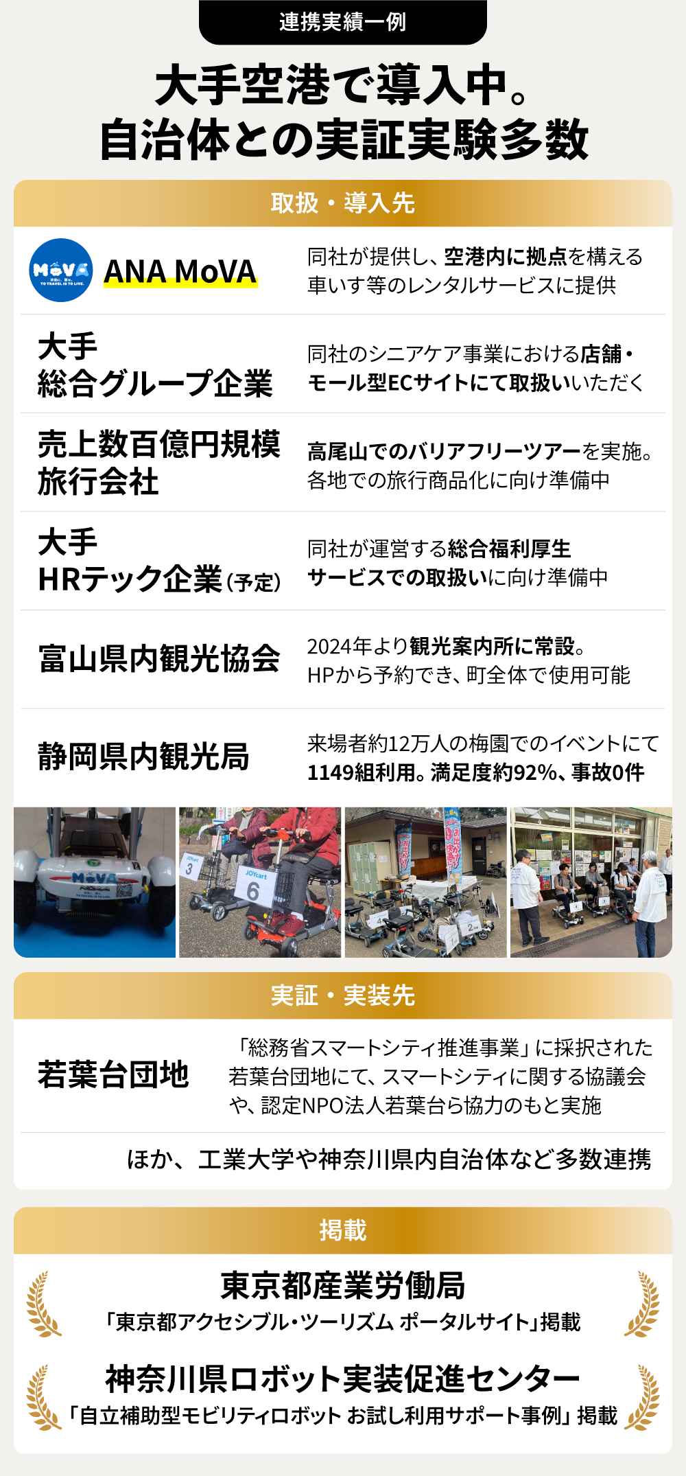 2025年7月からは、ANAホールディングス株式会社が推進する車いす等のレンタルサービス「MoVA(ムーバ)」でも採用いただいています。関西国際空港に続き、2026年3月より成田国際空港でも提供を開始。成田国際空港では、積極的な広告宣伝を行わずに開始初月で9回の稼働実績を記録しており、今後も国内主要空港への展開を目指しています。