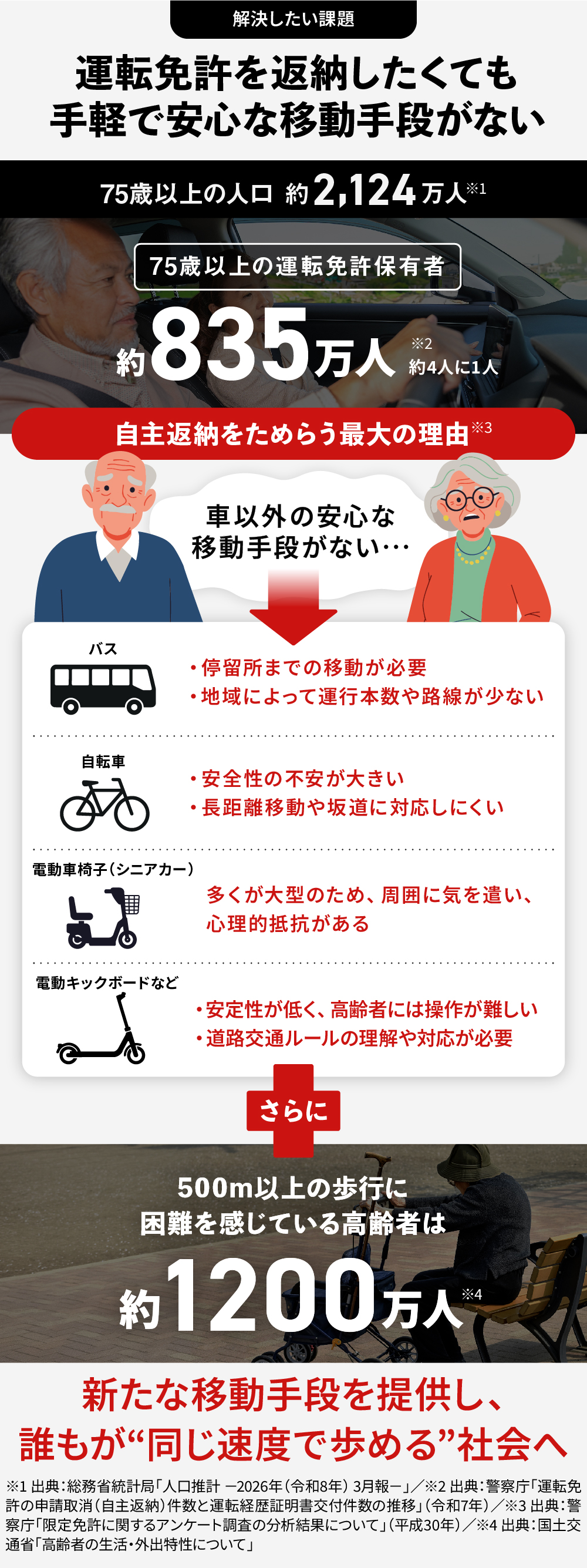 国土交通省の調査によると、日本では高齢者約3,600万人のうち、約3人に1人が500m以上の歩行に困難を感じており※2、また徒歩での移動には限界があります。弊社は、すべてを代替できるわけではありませんが。高齢者等の外出へのハードルを下げ、家族や周囲の人々と「同じ速度で歩める」社会づくりを目指しています。