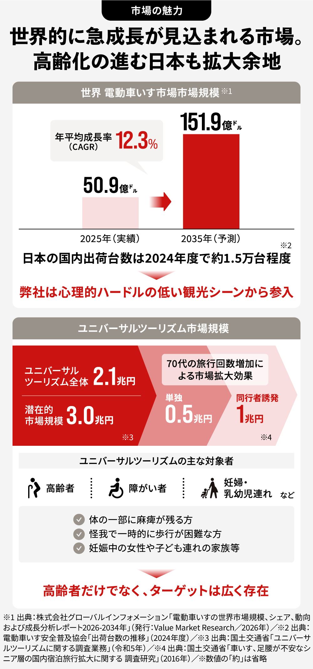 ※1 出典:株式会社グローバルインフォメーション「電動車いすの世界市場規模、シェア、動向および成長分析レポート2026-2034年」(発行:Value Market Research/2026年)/※2 出典:W社HP/※上記に記載の成長率や市場規模は、発行者の将来を示唆・保証するものではありません。