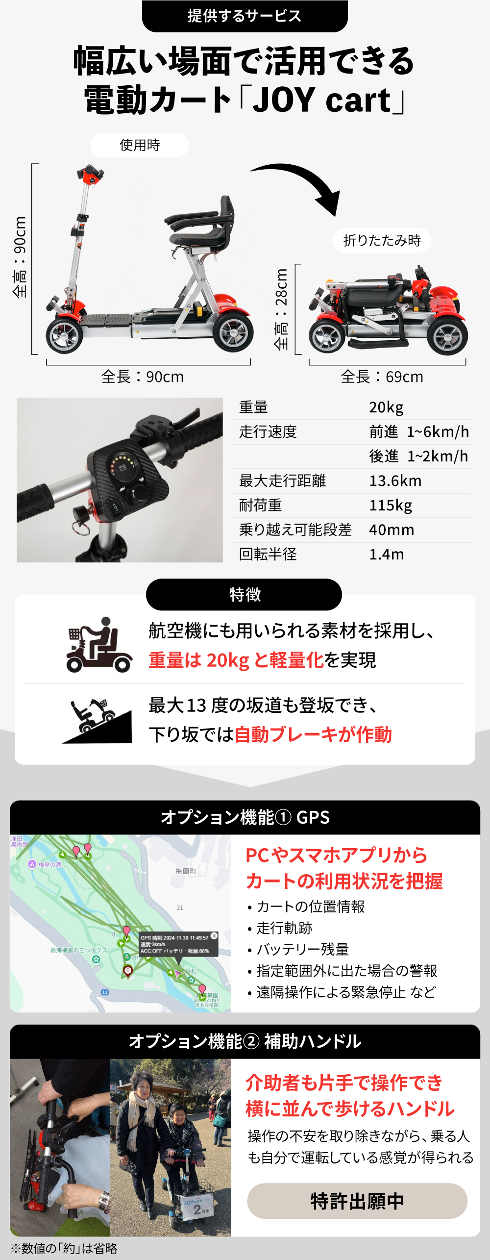 弊社は、日常生活において誰もが自由に移動を楽しめる社会の実現に貢献するパーソナルモビリティ「JOY cart(以下:JOYカート)」を販売しています。