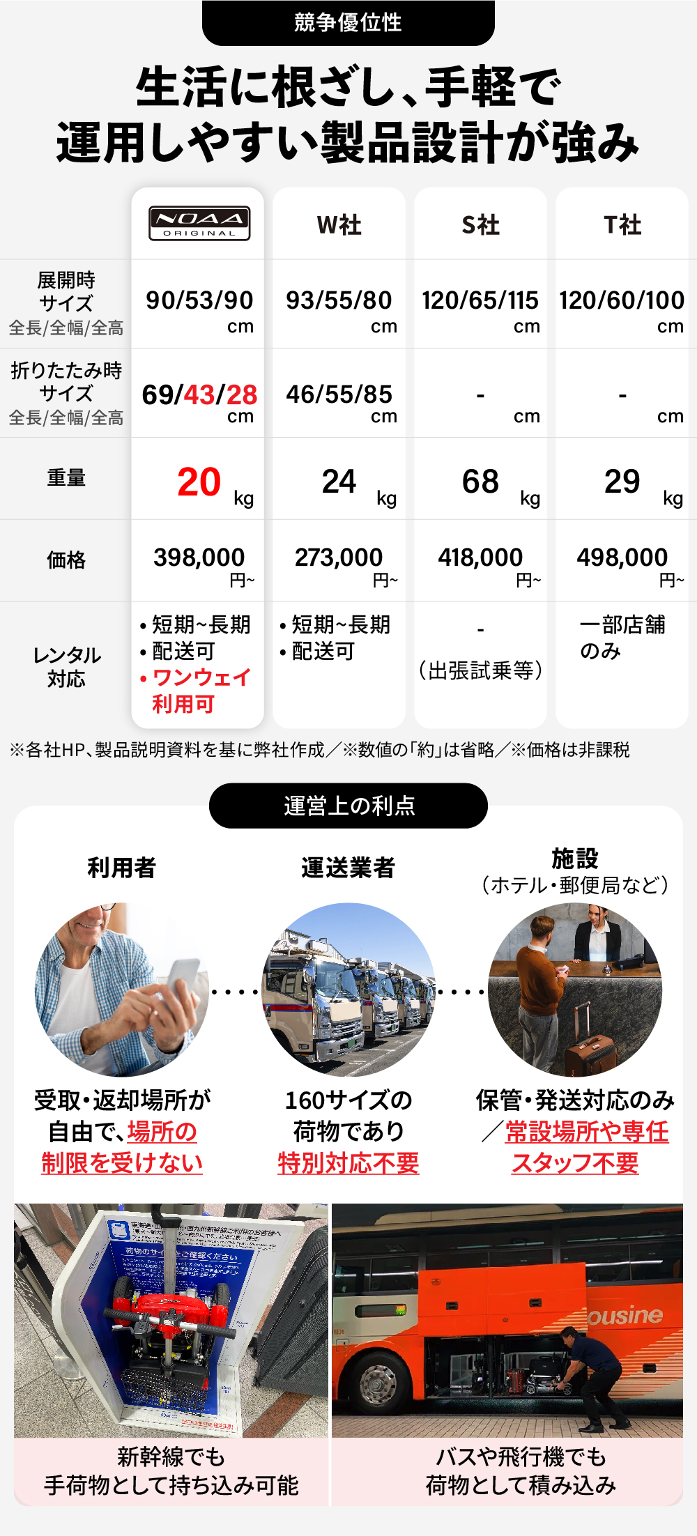 類似製品との大きな違いは、そのコンパクトさにあります。従来の製品では大型貨物としての特別配送が必要となるものが多く、レンタル時には指定拠点での貸出・返却が前提となるケースが一般的です。一方、「JOYカート」は約20kgと軽量で、160サイズ相当のスーツケースに収納できます。