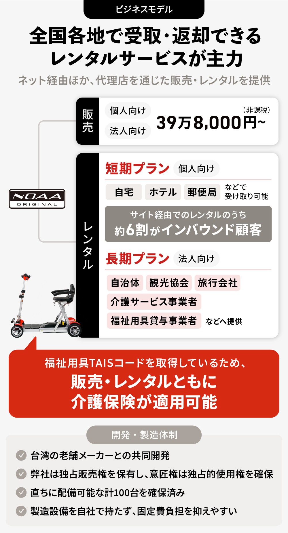 個人向けの短期レンタルプランでは、利用日数に応じた料金設定としており、弊社サイトや提携先店舗から申し込みが可能です。現在は、サイト経由でのレンタルの約6割をインバウンド利用が占めており、訪日需要の取り込みにもつながっています。また、「JOYカート」は福祉用具TAISコードを取得しているため、介護保険を活用した販売・レンタルにも対応可能です。