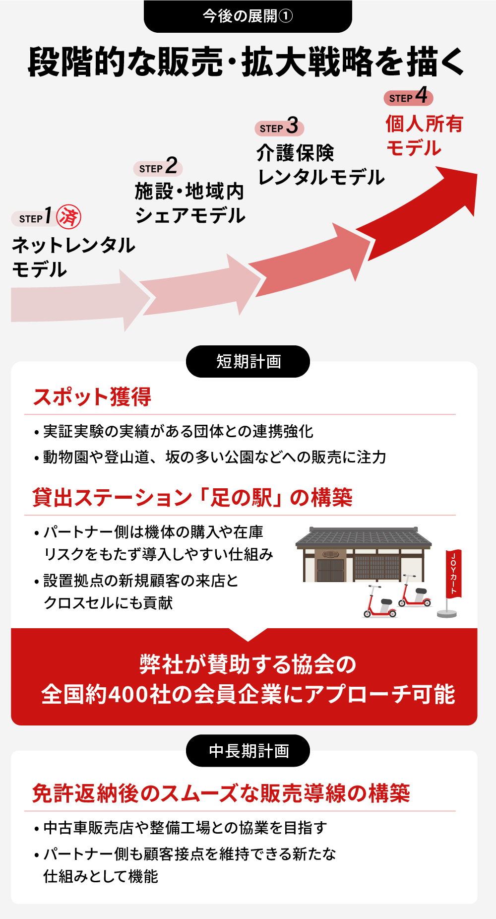 さらに、中古車販売店や整備工場と協業し、免許返納後に「JOYカート」にスムーズに切り替えていただく新たな仕組みづくりも進めていきたいと考えています。