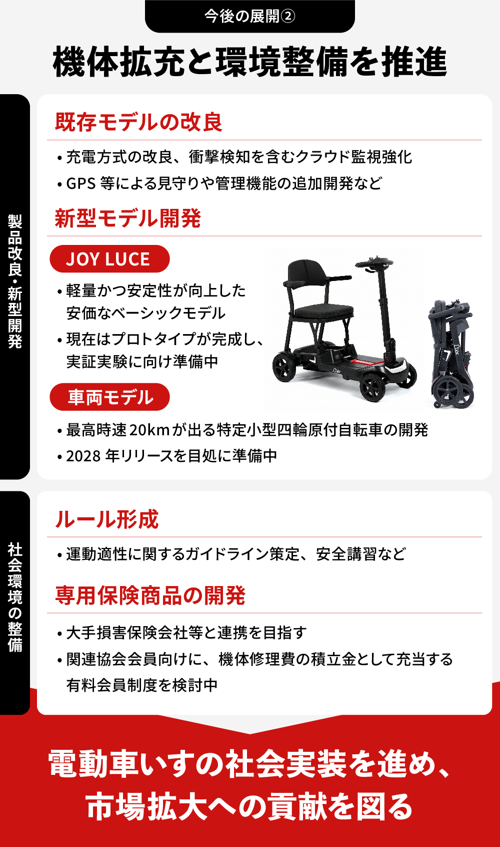 加えて、軽量性、安定性、価格競争力を追求したベーシックモデル「JOY LUCE」の開発も進めています。さらに2028年9月期には、免許返納後の第2の足として長距離移動に特化した新型車両(特定小型四輪原付自転車)の販売も計画しています。