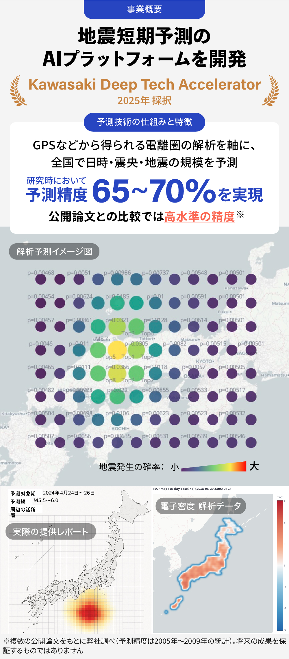 å°çäžç©º80ã1,000kmã«äœçœ®ããé»é¢åã§ã¯ãå°éçºçåã«å°æ®»å€åã«äŒŽãé»å Žã倧æ°éåæ³¢ã®åœ±é¿ã«ããé»åå¯åºŠãå€åãããšããç ç©¶ææãå ±åãããŠããŸããåŒç€Ÿã¯ãã®çŸè±¡ã«çç®ããé»é¢åããŒã¿ã軞ã«è€æ°ã®é¢é£ããŒã¿ãçµ±åããAIè§£ææè¡ãéçºããŠããŸããé»é¢åã®é»åå¯åºŠãäžæ¬¡å ã§å¯èŠåããæè¡ã«ãããŠã¯è«æãçºè¡šããŠãããç ç©¶æã®è©äŸ¡ã§ã¯ãäºæž¬ç²ŸåºŠ65ã70%ãå®çŸããŠããŸãâ»ã