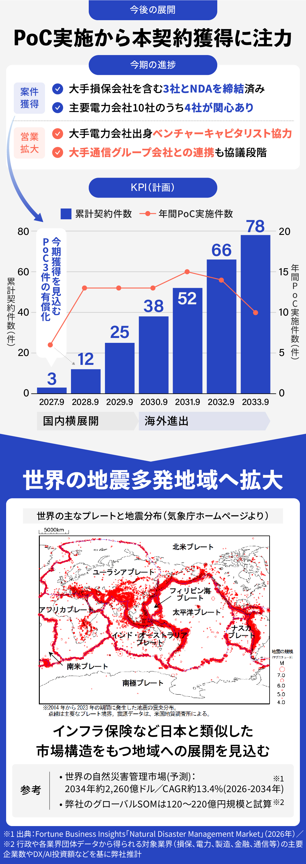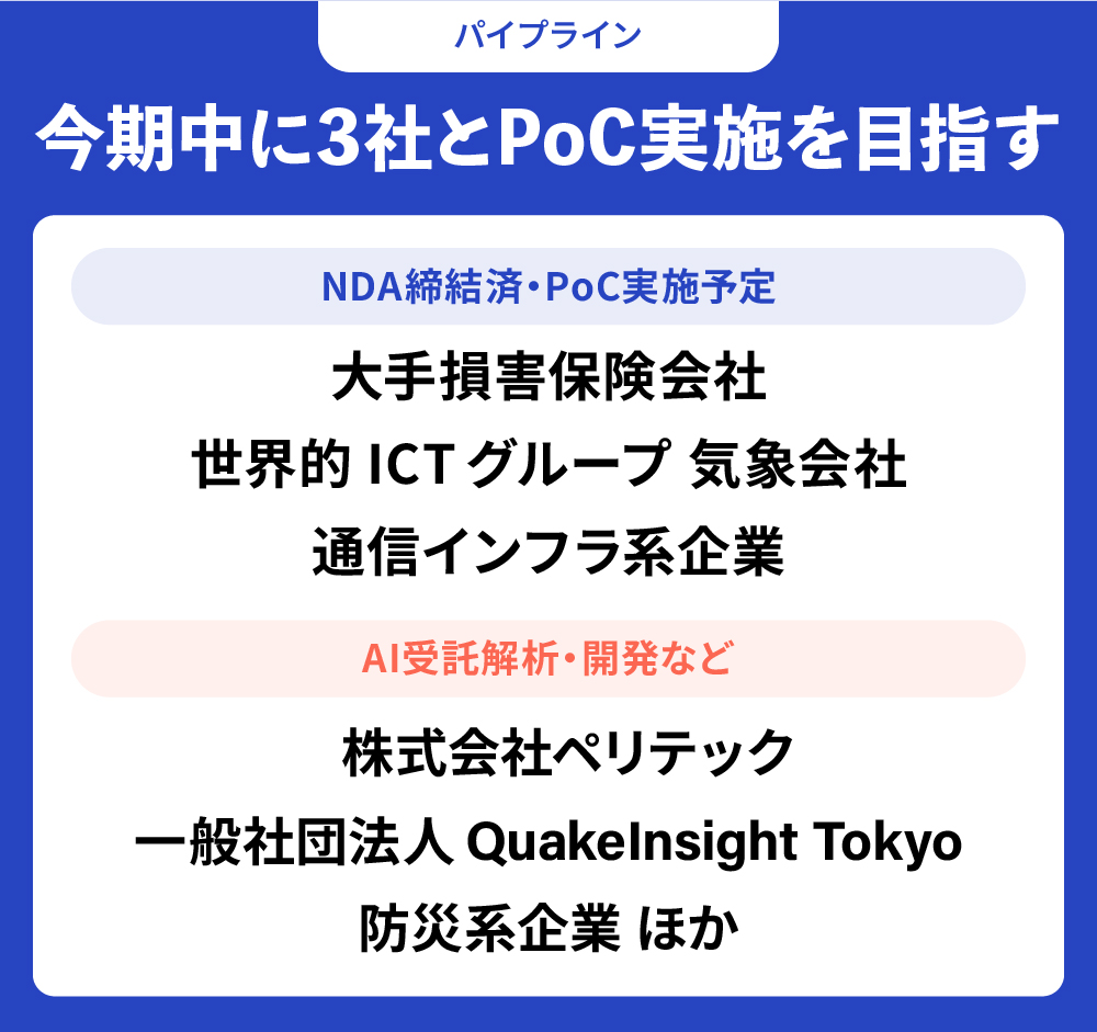 2026幎床ã¯ãæ¬å¥çŽã®ç²åŸãšPoCã®å®è¡ãæåªå äºé ãšããŠããŸãã倧ææå®³ä¿éºæ ªåŒäŒç€Ÿãå«ã3瀟ãšNDAãç· çµæžã¿ã§ããã2026幎7æããã®PoC宿œãç®æããŠããŸãããŸããé»åäŒç€Ÿã«ã€ããŠã¯ãäž»èŠ10瀟ã®ãã¡4瀟ããèå³ãæã£ãŠããã ããŠããã倧æé»åäŒç€Ÿåºèº«ã®ãã³ãã£ãŒãã£ãã¿ãªã¹ãã®ååãããšã«ãå°å ¥ãç®æããŠããŸãã
